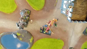 Rechts lauern Squigman und Rübezahl hinter dem alten Gemäuer, gegenüber stehen ein großer Streitwagen, 4 Minos mit Waffenpaar