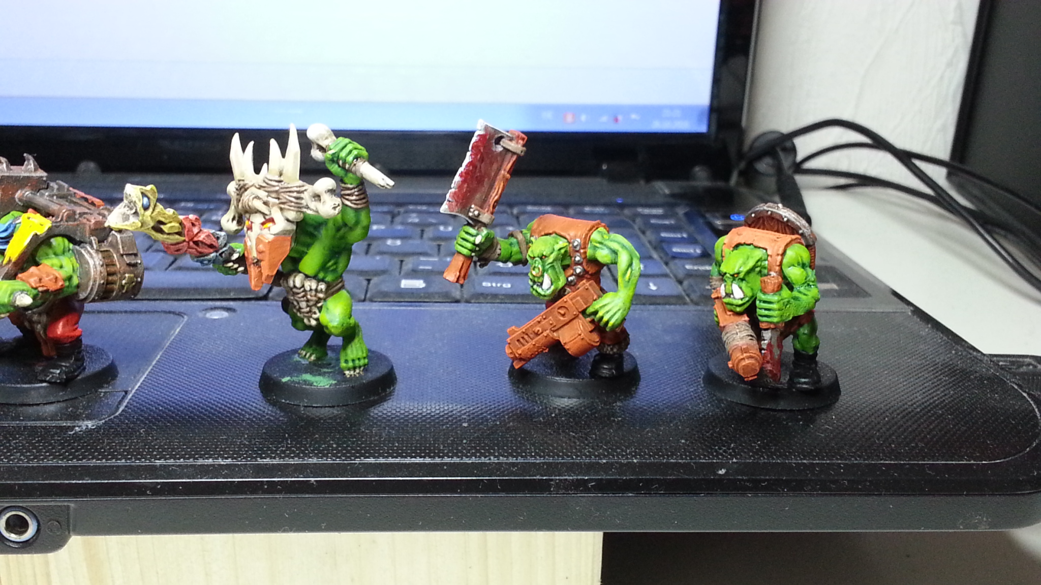 4 Lootas, ein Wildork-Schamane (welcher als Wyrdboy herhalten muss) und zwei stinknormale Boys mit Wummen. Darüberhinaus habe ich den im September angefangenen Blitza-Bommer trockengebürstet, die Piloten fertig und diverse Details angefangen. -