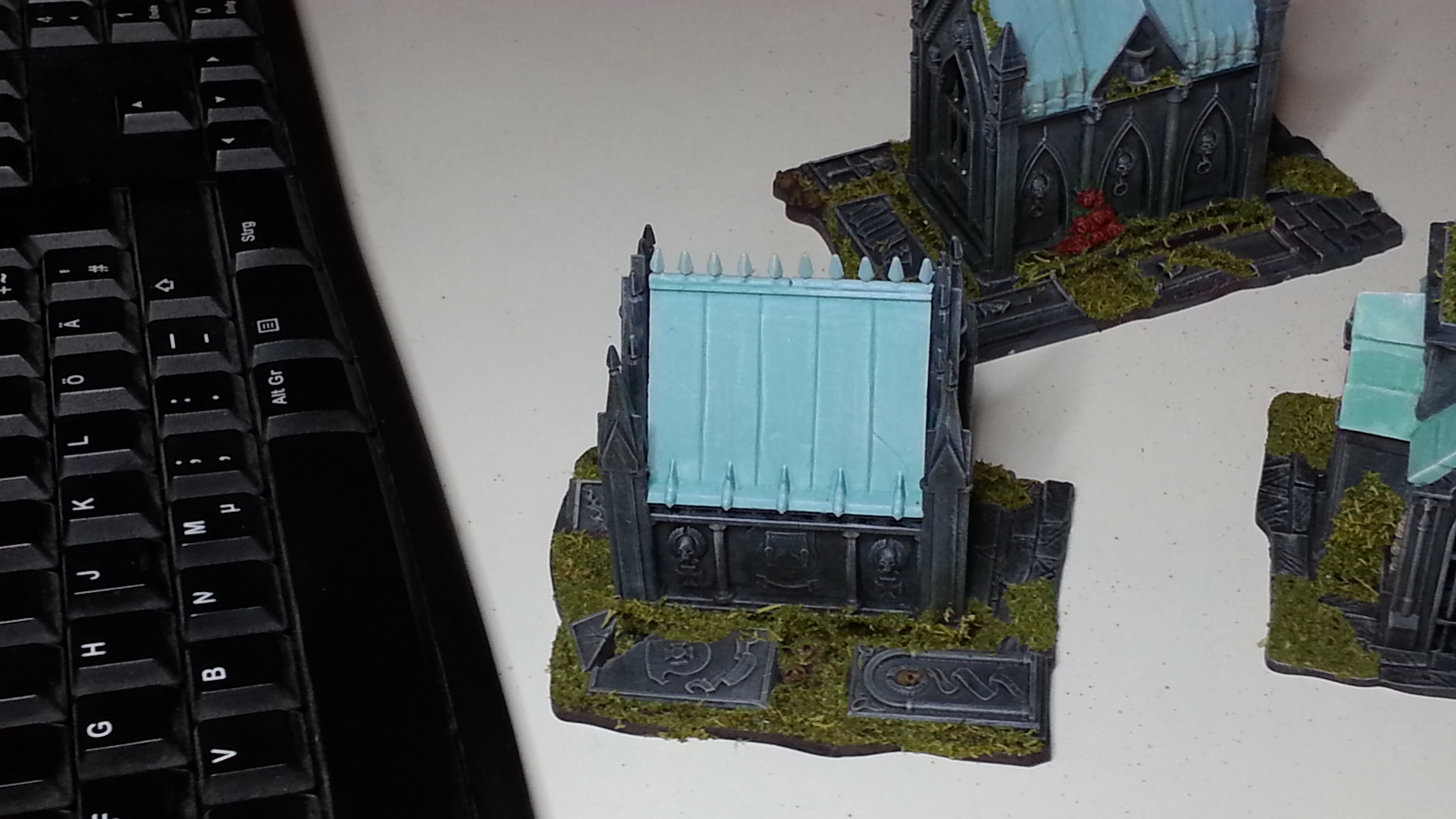 Habe deshalb mit Mischungen aus Lahmia Medium, Nihilakh Oxide und Blue Horror experimentiert, um den Dachplatten eine durchgängige Grünspan-Grundierung zu verpassen. Die Vertiefungen und Rillen wurden mit ein wenig Biel-Tan Green nachgezogen und das, was sich trockenbürsten ließ, mit White Scar gehighlighted.