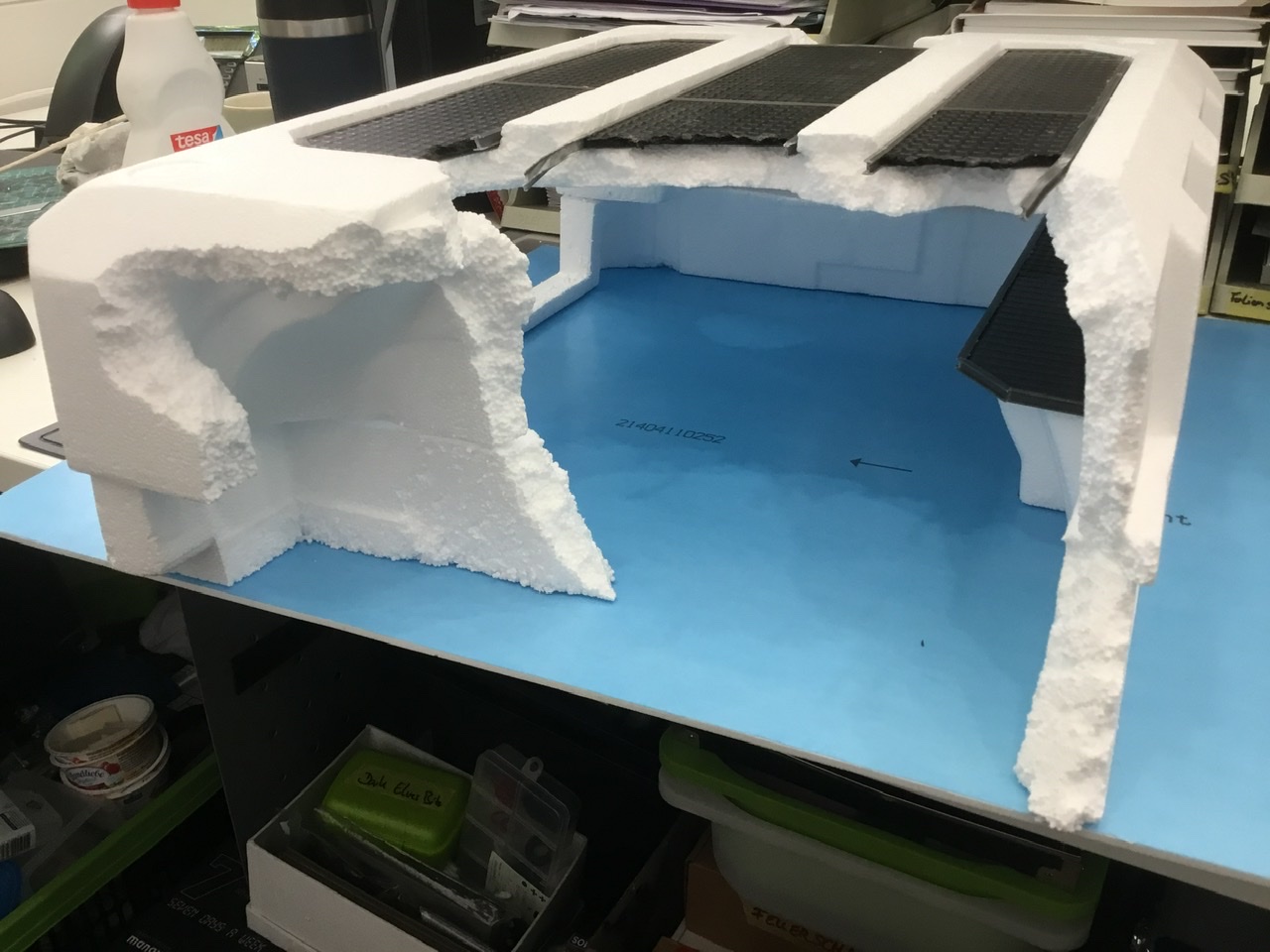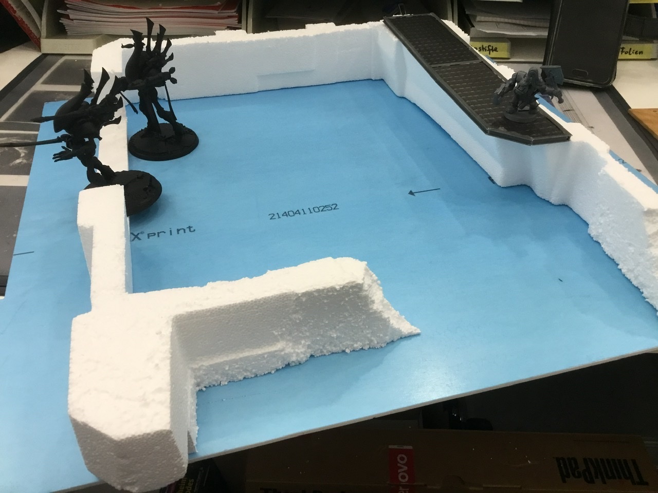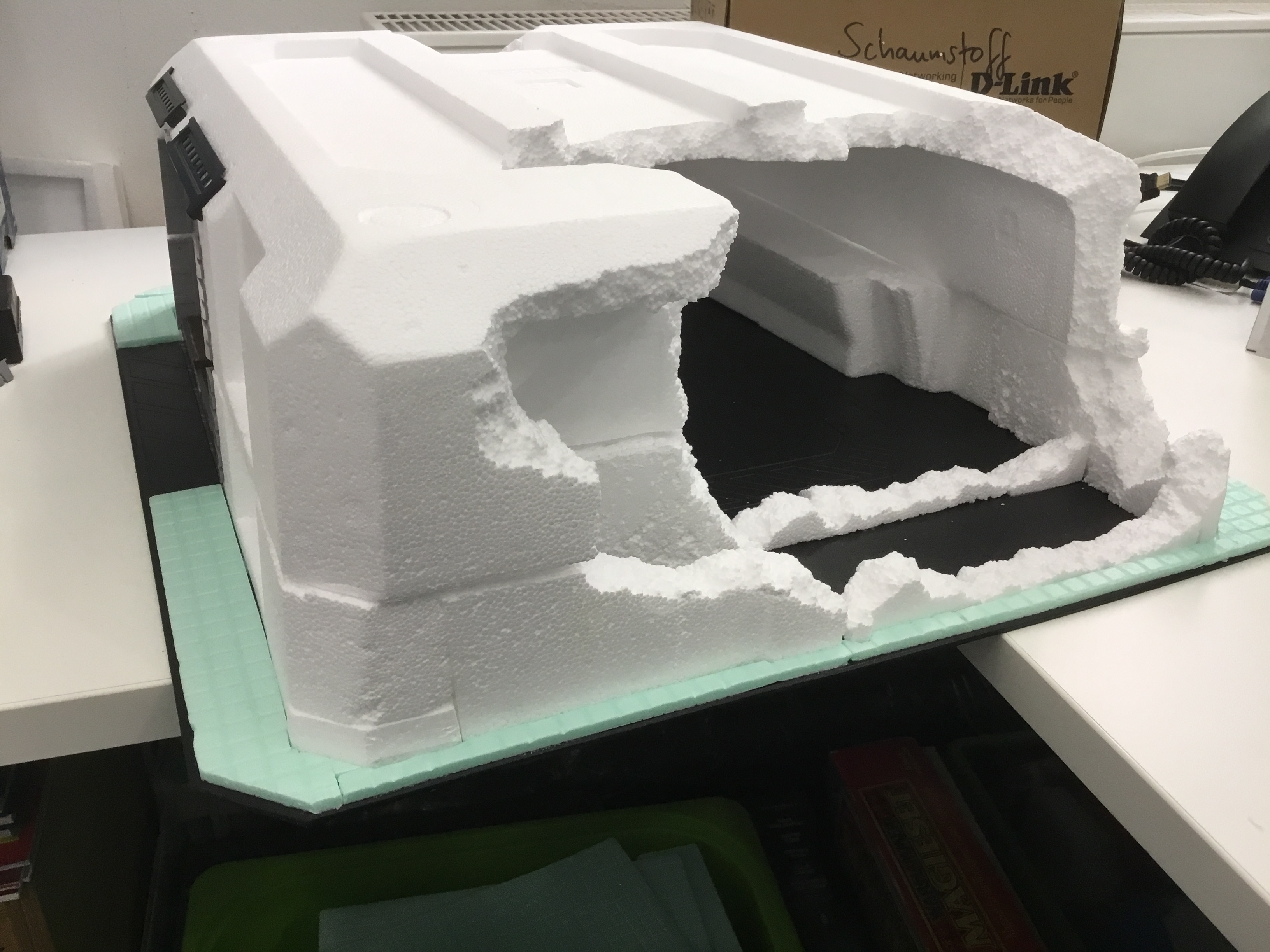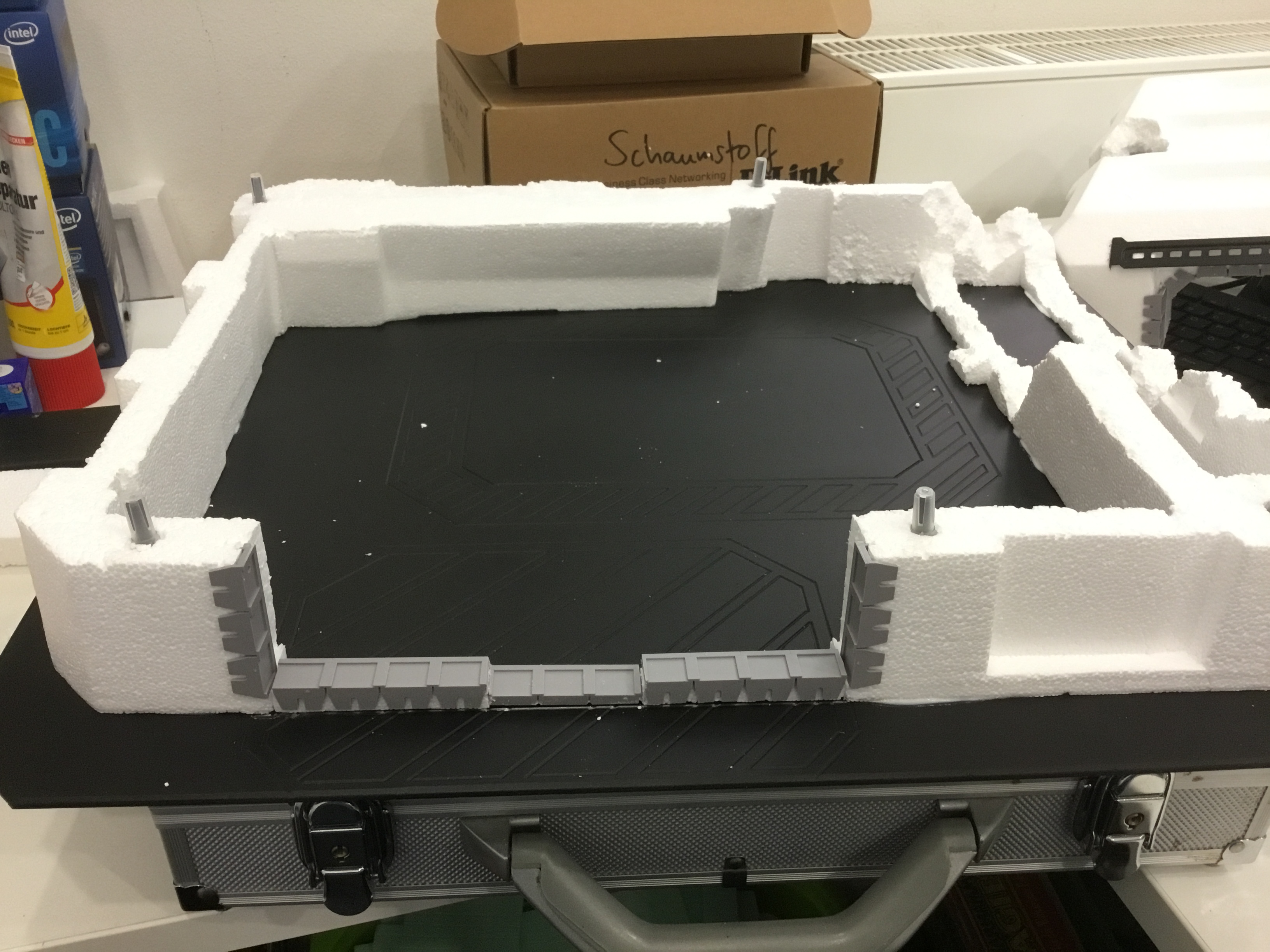 Ursprünglich wollte ich nur ein Styroporteil nutzen, aber ich musste feststellen, dass dann die meisten Fahrzeuge und Läufer nicht reinpassen würden... Aber seht selbst.
