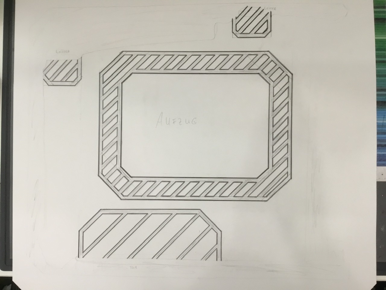 Bodenmarkierungen hinzugefügt - in der Mitte wird’s nen Aufzug (natürlich nach unten...) geben.