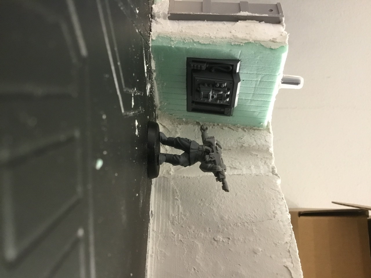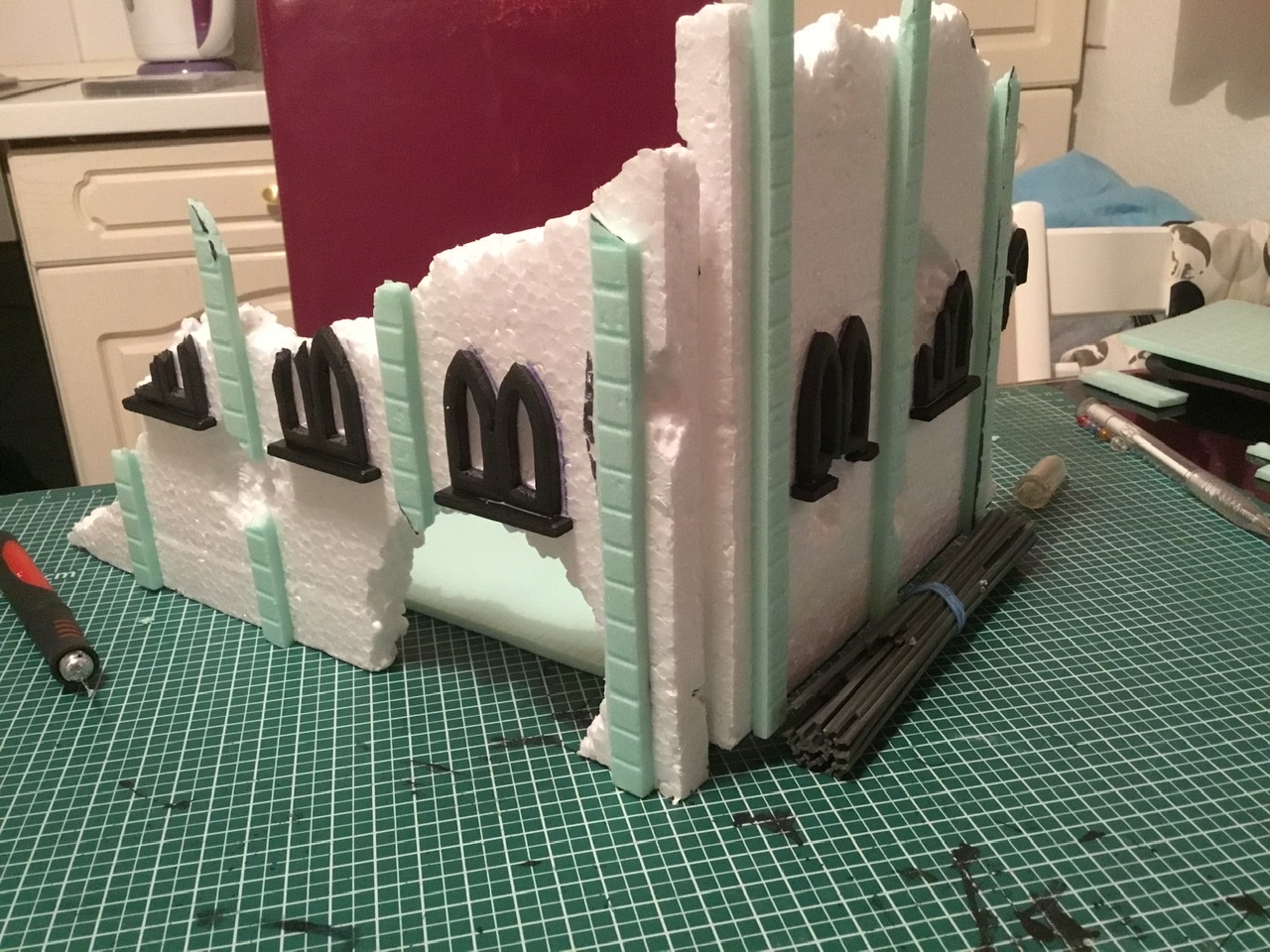 Soo... Habe das Base grundiert und befestigt, dann mussten noch die abgerissenen Mauern bzw. deren Reste ergänzt werden - sonst sieht's so nackt und glatt auf dem Boden aus.
