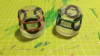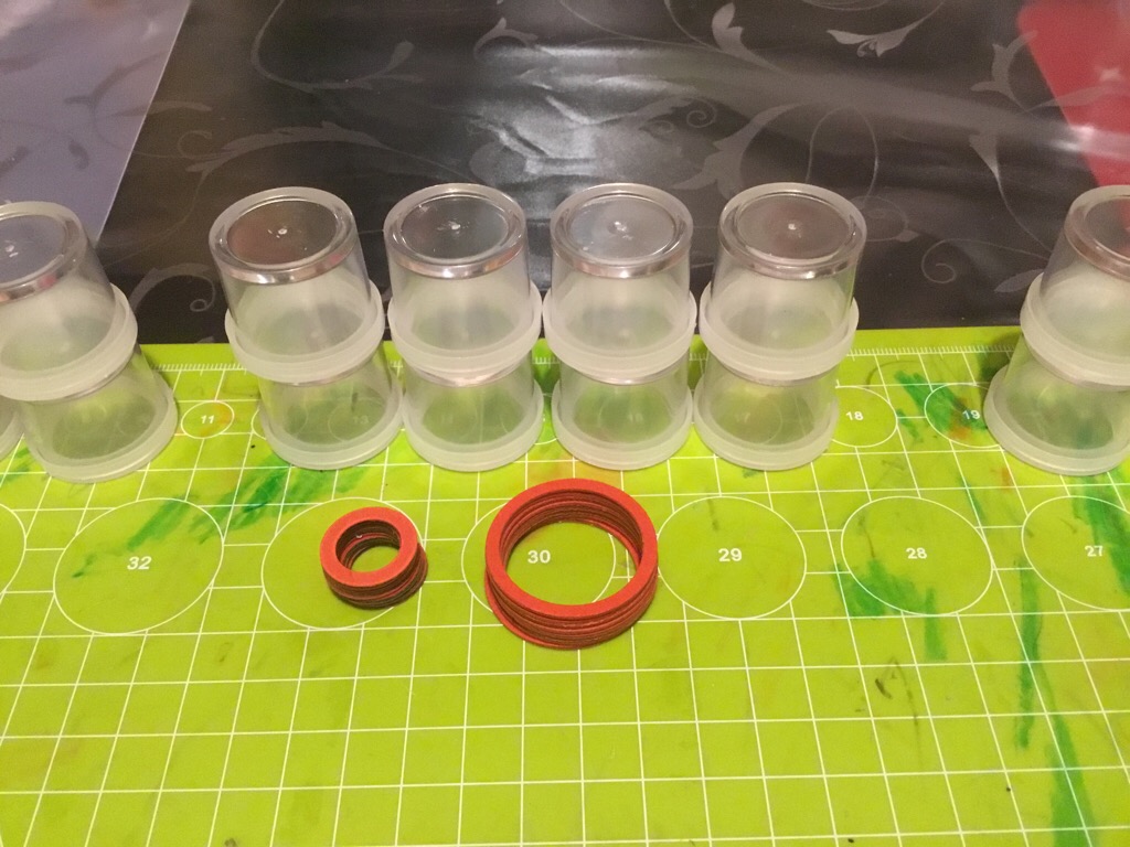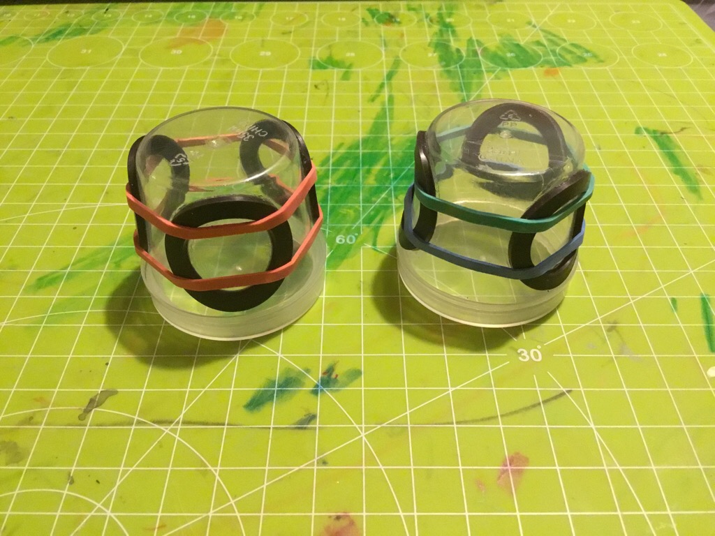 Habe begonnen, die größeren Behälter mit Sichtfenstern zu versehen - Gummidichtungen mit Sekundenkleber aufgebracht und mit Gummis [zum Trocknen] fixiert.