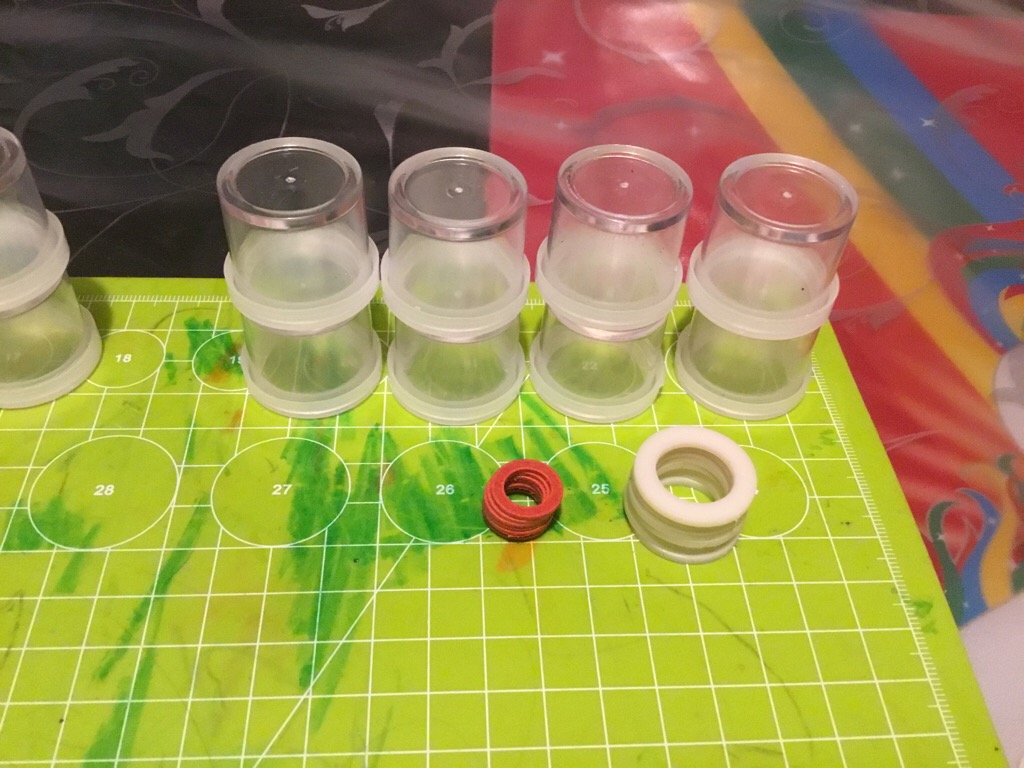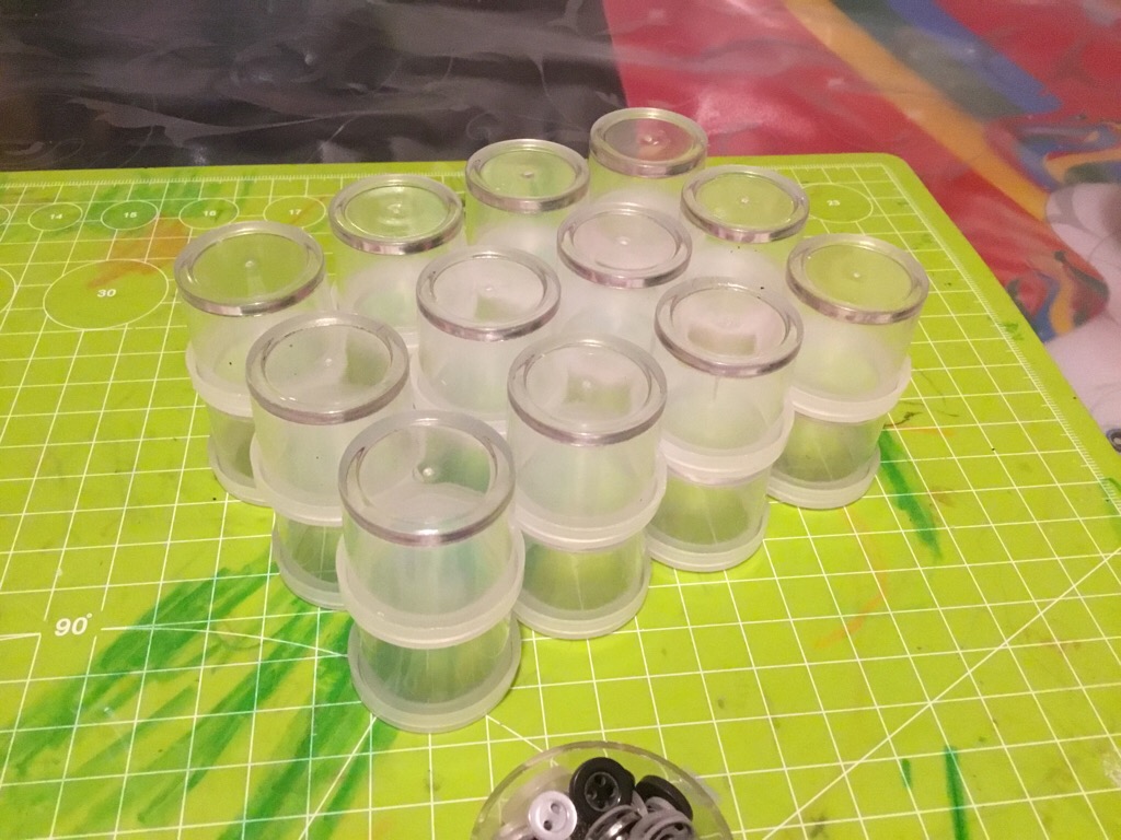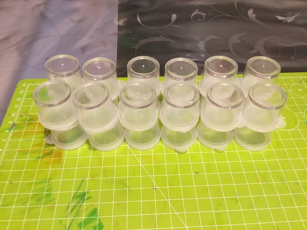 Heute Abend... ähh... frühmorgens... habe ich noch ein Miniprojekt dazwischen geschoben, das mich im 1€-Laden angesprungen hat: Zwei Dutzend Container für Promethium o.ä. in flüssiger Form, da man ja nie genug modulare Geländestücke für Barrikaden o.ä. haben kann.