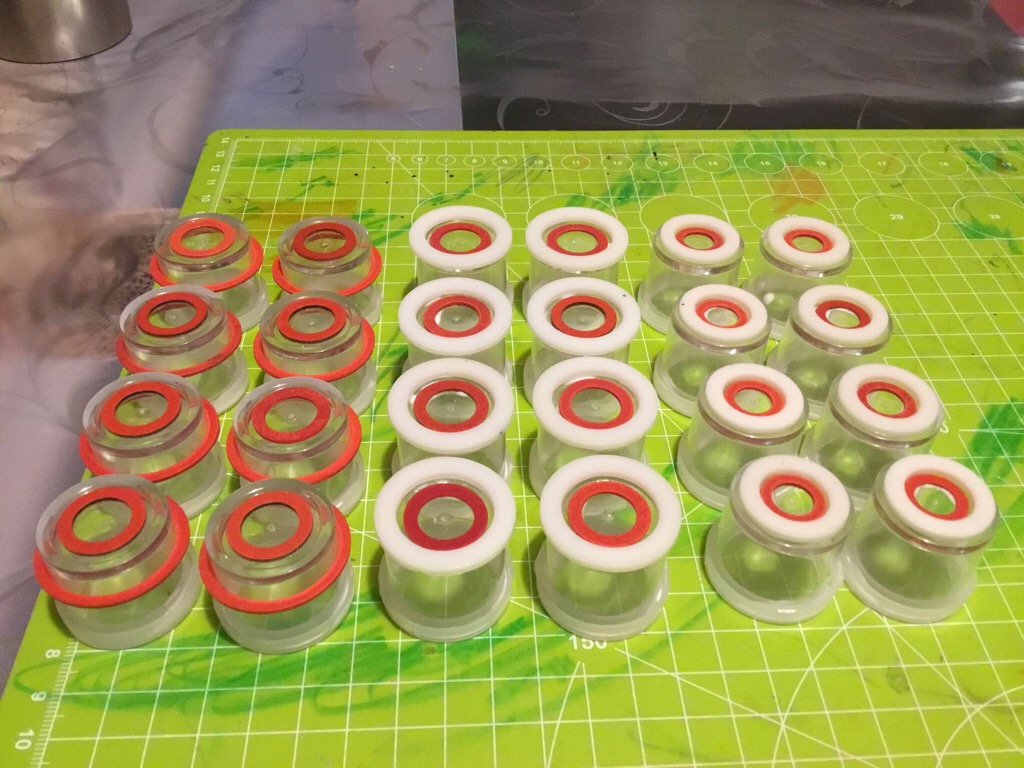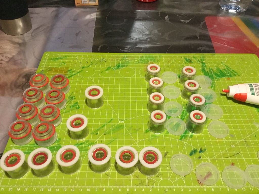 Mal sehen, was das mit der Flüssigkeit im Inneren wird... Vielleicht sogar echtes, gefärbtes Wasser? Wenn ich die Deckel ordentlich verklebe, sollten die Dinger ja dicht bleiben. Hmmm...