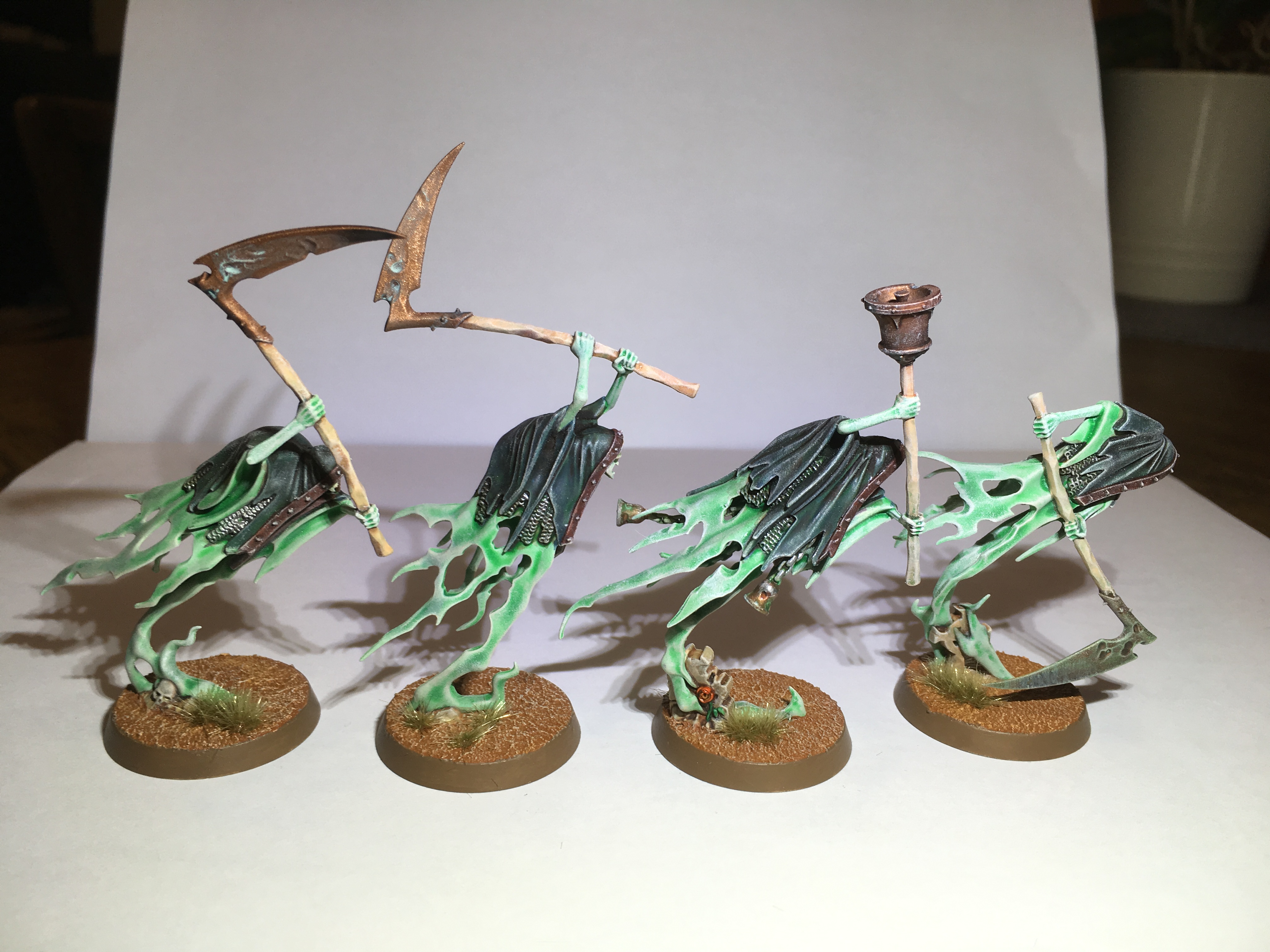 So ich bin jetzt fertig mit 4 Grimghast Reaper, bitte das Augenmerk auf den mit der Totenglocke, am Stein ist ne blühende Rose ala wolle Rose kaufen oder besser sie kriegen doch nicht alles tot .