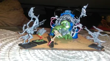 Die Horrors sind gerade am Zaubern / Todbringer binden. Dies werde ich mit Kupferdrähten darstellen. Von jedem Horror geht im hohen Bogen ein Kupferdraht um die "Spirale" am Todbringer. Evtl auch noch jeweils einer der Leichen vom Schlachtfeld herzaubert.