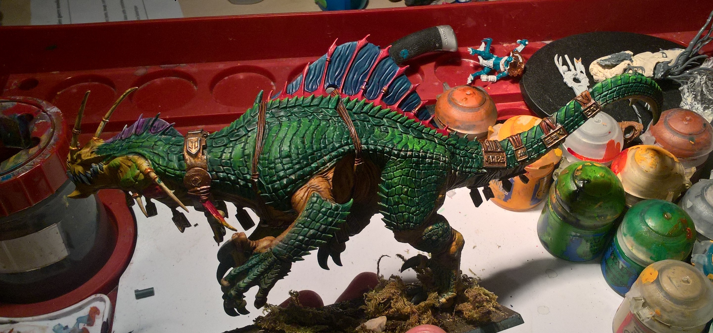 Ihr könnt euch nicht vorstellen wie lange ich an diesem Troglodon gesessen habe und jede verdünnte Schicht Grün 300000 aufgetragen habe, zwischendurch habe ich auch nochmal das Farbschema gewechselt, leider ist mein (Handy)Fotoapparat nicht sooooooo toll und man sieht nicht gut dass das Grün ineinander fliesst... Ich hoffe er gefällt euch Ich hatte viel Spass beim bemalen! Ich lieeebe es ja alles so aufwendig wie möglich zu bemalen :love::]:saint: