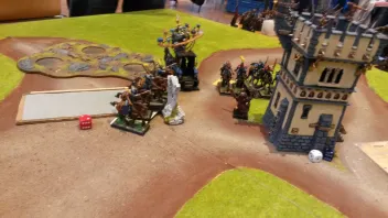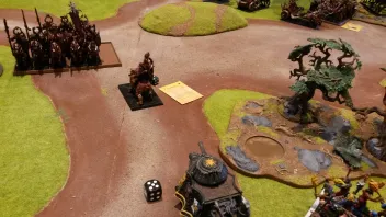 Meine beiden Geschütze haben bisher nicht viel gemacht, jetzt gehen ihnen aufgrund der multiplen Nahkämpfe die Ziele aus.Links außen donnern seine Wasteland Knights und sein Lord mit einem LP in meinen Dampfer