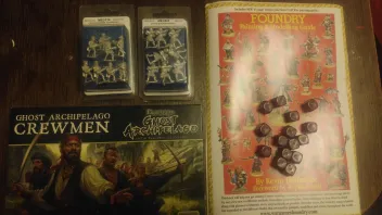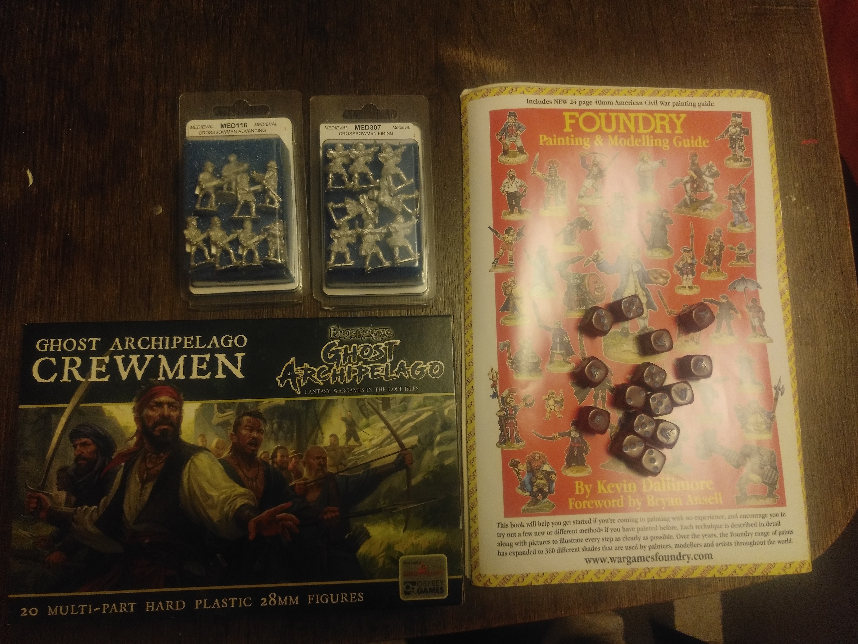 Auf der Werbebroschüre von Foundry liegen neu erstandene Würfel von Warlord Games-