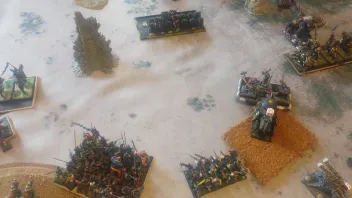 Jetzt legt die Lafette an(die zweite hat wegen des Hügels keine Sicht)- 3 Schüsse, 1 Treffer- keine Wunde. Letzter Versuch- 18 Armbrustschützen auf die 4 mit
