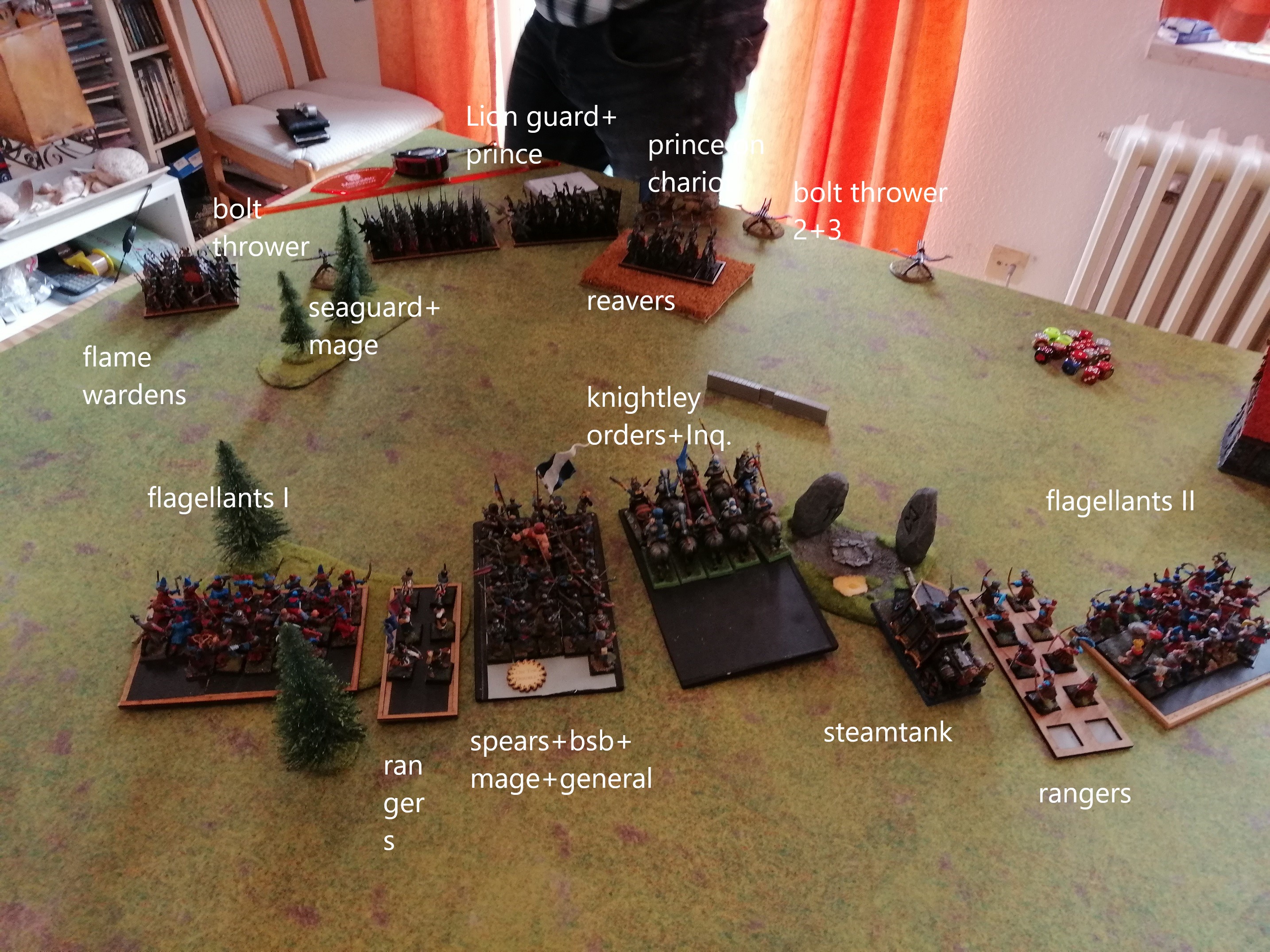 30 Seegardisten mit Pyromane, 25 flame wardens(becalming banner), 20 Lion Guard mit bsb und Prince mit Sliver(MocT?), abgerundet durch 5