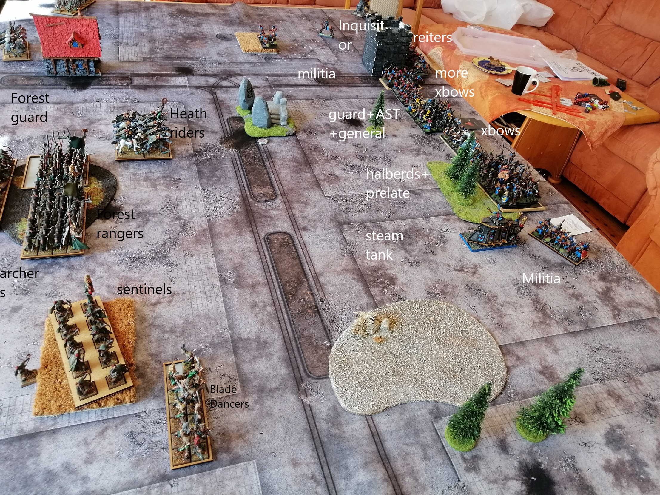 in einer Runde wird Murphys Law wieder bestätigt, da kam viel Pech für die Waldelfen zusammen. Die Kampftänzer kriegen noch eine Miliz vorgesetzt und das Spiel ist aus.