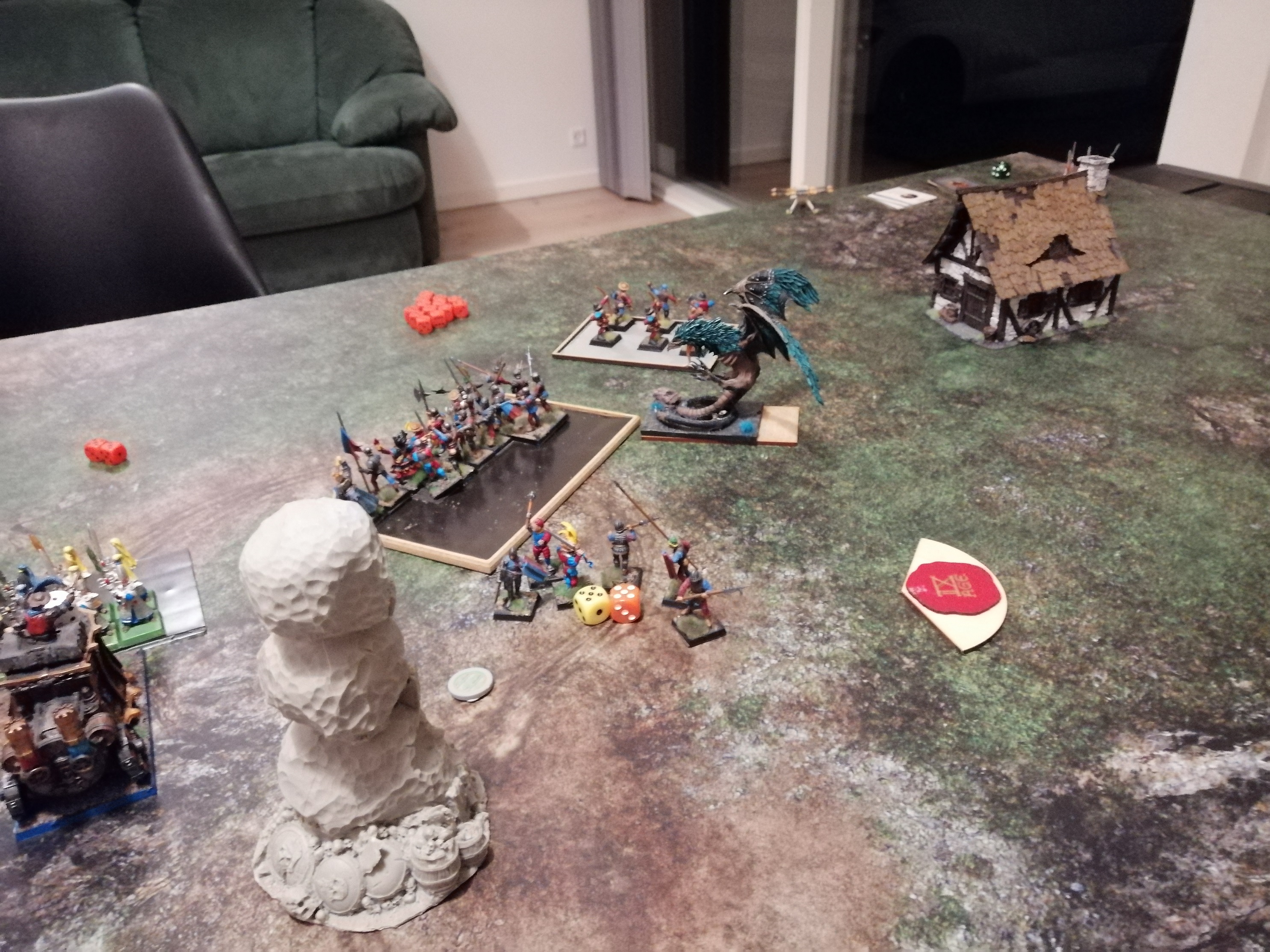 Damit wird der Kampf um den rechten Marker zwischen meinen Rittern mit Hexenjäger und seinen Speerträgern entschieden.