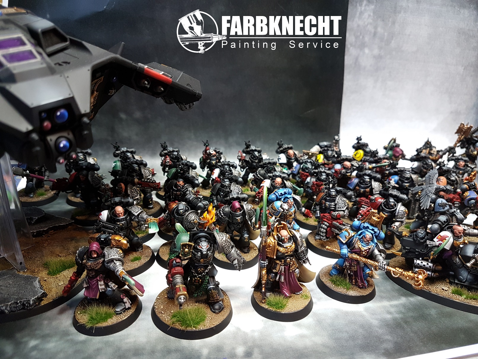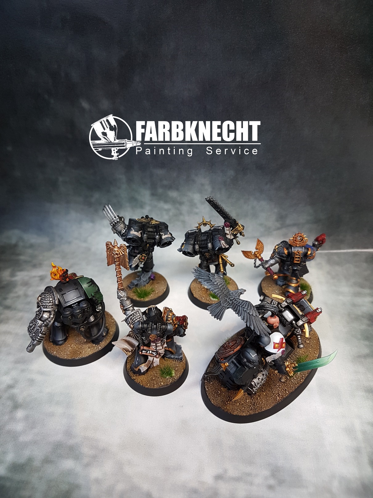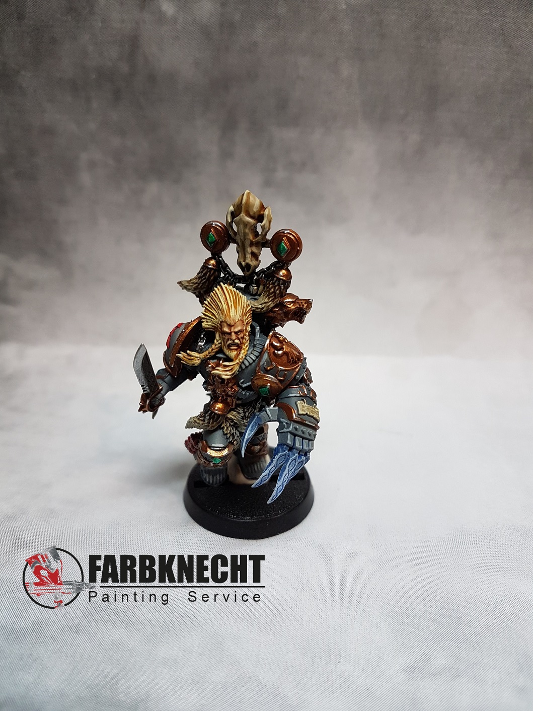 Paket 1, 2 feine Akzente, einfaches Freehand, sehr detailliertes Gesicht, aufwendiges Emblem, Aufwändige Effekte: Weathering, Kampfspuren, Rost, Leuchteffekt, Schlamm verkrustete Ketten