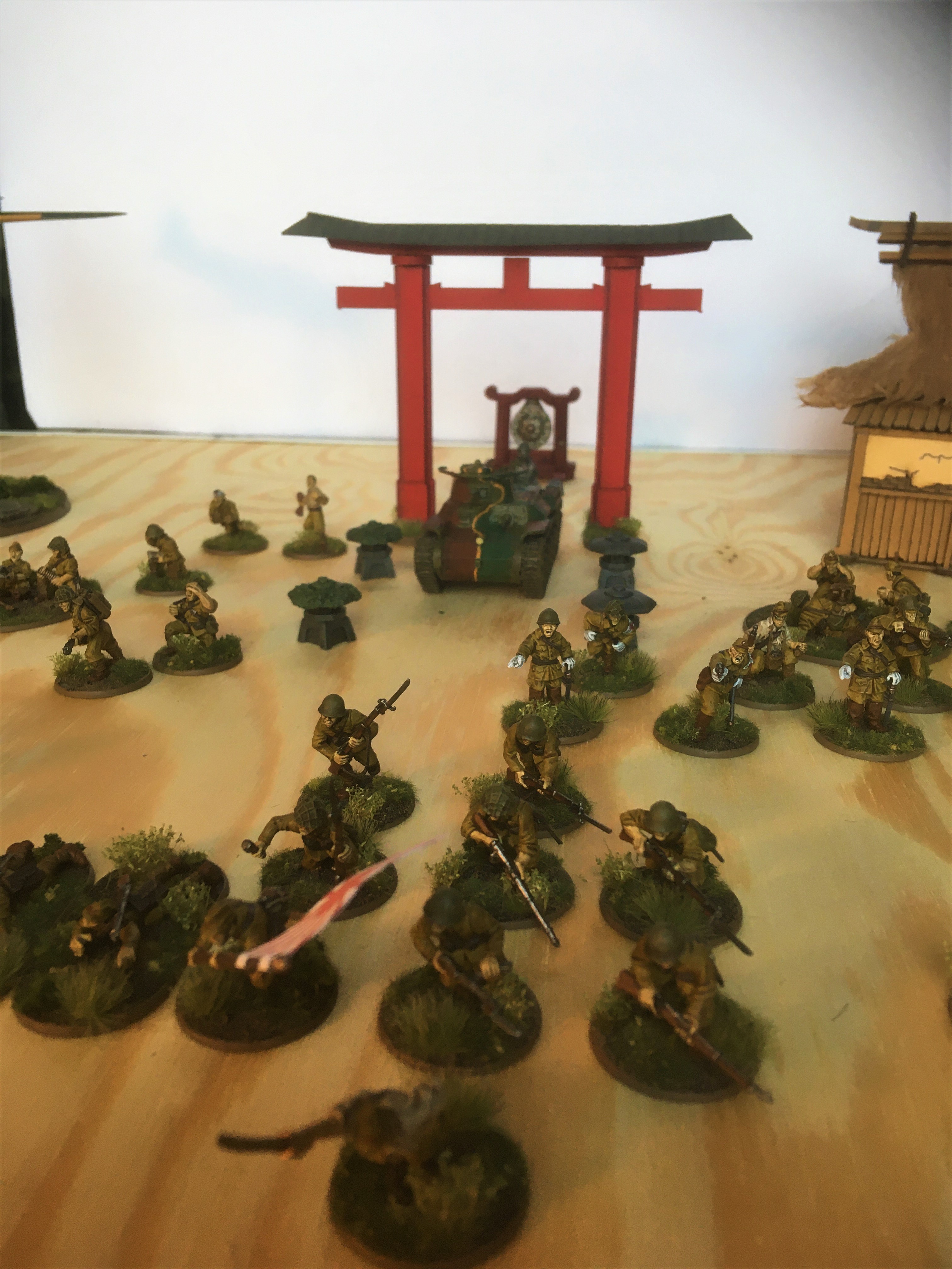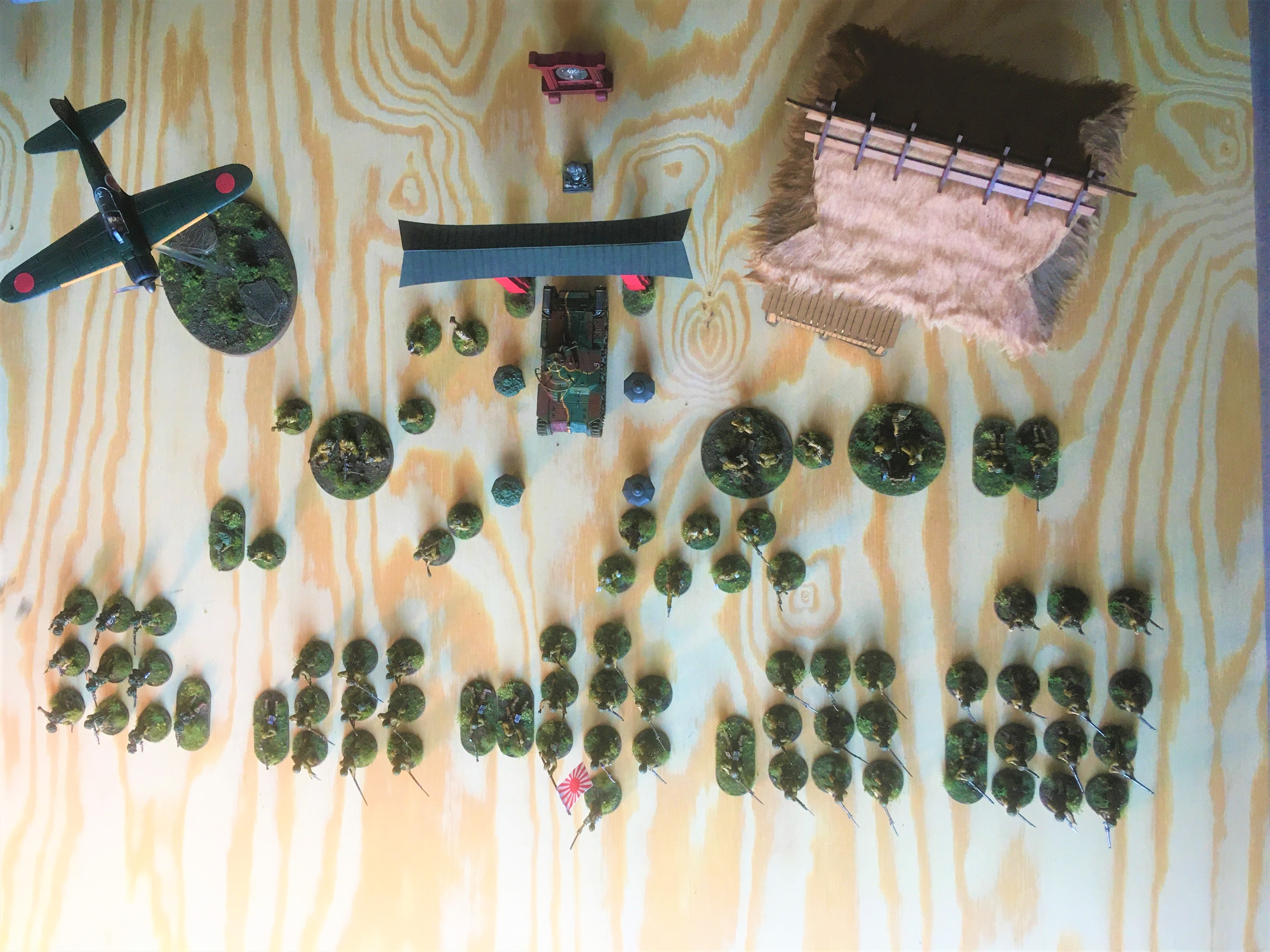 Laut dem Armybuilder sind es 1430 Punkte, die so aufgestellt werden könnten. Ausnahme der Flieger: die Zero ist nur "Deko" für den Einsatz des Forward Air Observer.