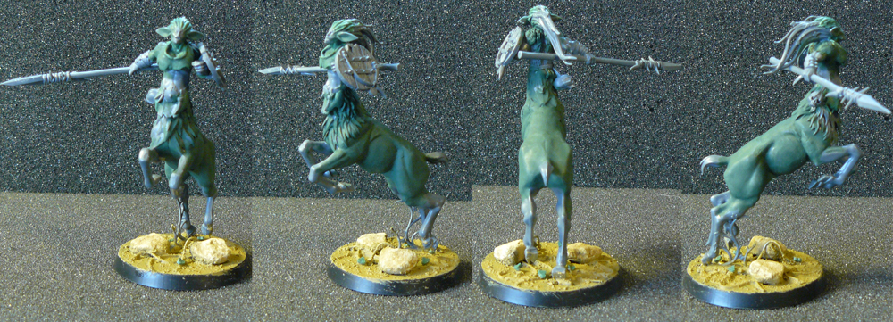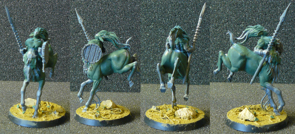 Und nein, Waldelfenpferde haben keinen Sattel, sondern eine Art Satteldecke, recht dezent. Die hatte ich auch erst vorgezogen, empfand sie dann aber als zu filigran und nicht martialisch genug. Tja, Geschmäcker. Ich würde aber gerne auch mal Centigors mit Waldelfenpferden sehen (oder was es sonst so gibt...) -