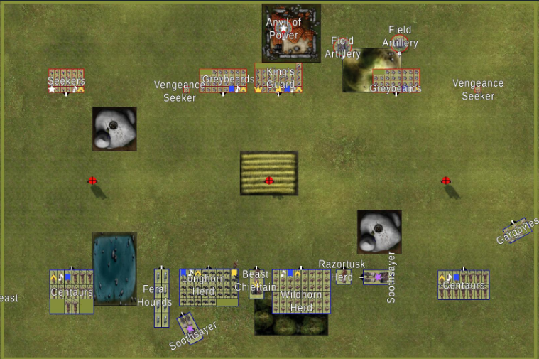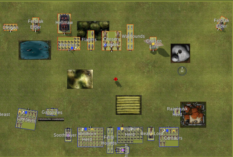 In der letzten Runde kann der Titano die Zentauren angreifen aber dann hat die Kröte nur Moral 2 um sich zu sammeln also macht er es nicht und die Kröte sammelt sich dann doch schon mit der 2 :tongue:. Die Krieger kommen nicht an den Maker ran und holen sich die Zentauren mit GW.