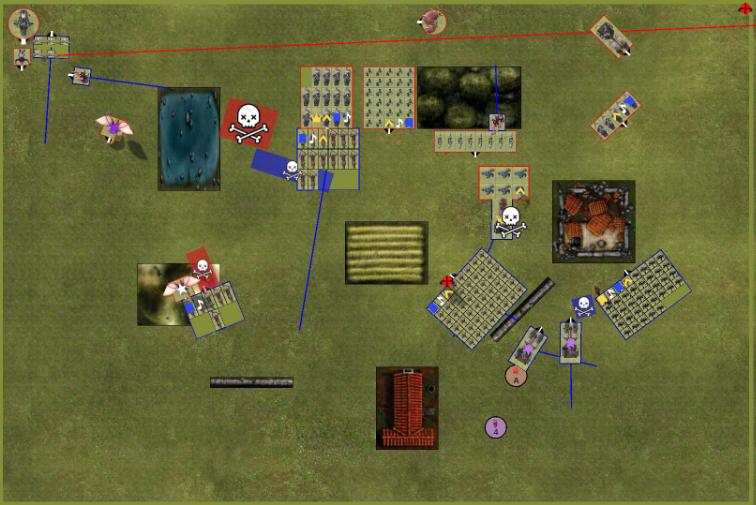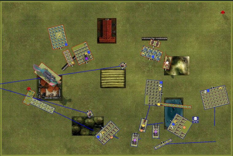 Im Gegenzug macht mein Gegner einen Fehler die Schweinereiter die die Hunde geschlagen haben laufen vom Feld und durch das Umlenken in die Generals Einheit ist das Spielglück früh auf meiner Seite. Außerdem Geht der General in die Trolle und das eine Beast in den Rückender Hunde.