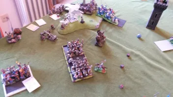 Seine Runde zwei. Die 10 Greybeards rücken links vor Richtung peasant crusaders, sein Vengeance Seeker