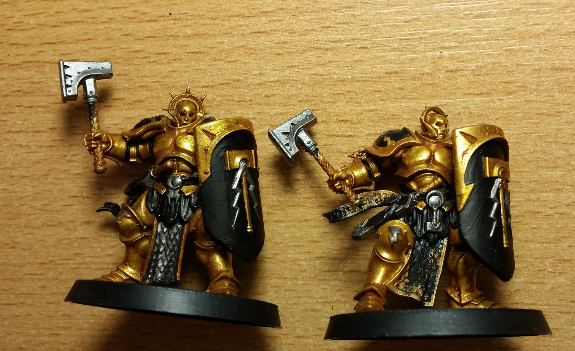 Die Fists of Sigmarite haben fast genau das Farbschema nur sind die mir zu bunt (Wappenrock, Waffengriffe, Lendenschurtz, alles in ner anderen Farbe). Ich bring vll. noch eine Farbe (rot?) rein. Und das beste ist (davon abgesehen, dass sie fast das Farbschema haben, das ich machen wollte): Sie passen genau zu dem fluff, den ich sonst für einen eigenen Stormhost ausgedacht hätte. Also nenn ich sie einfach Fists of Sigmarite und bemal sie weniger bunt. ![]()