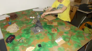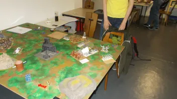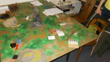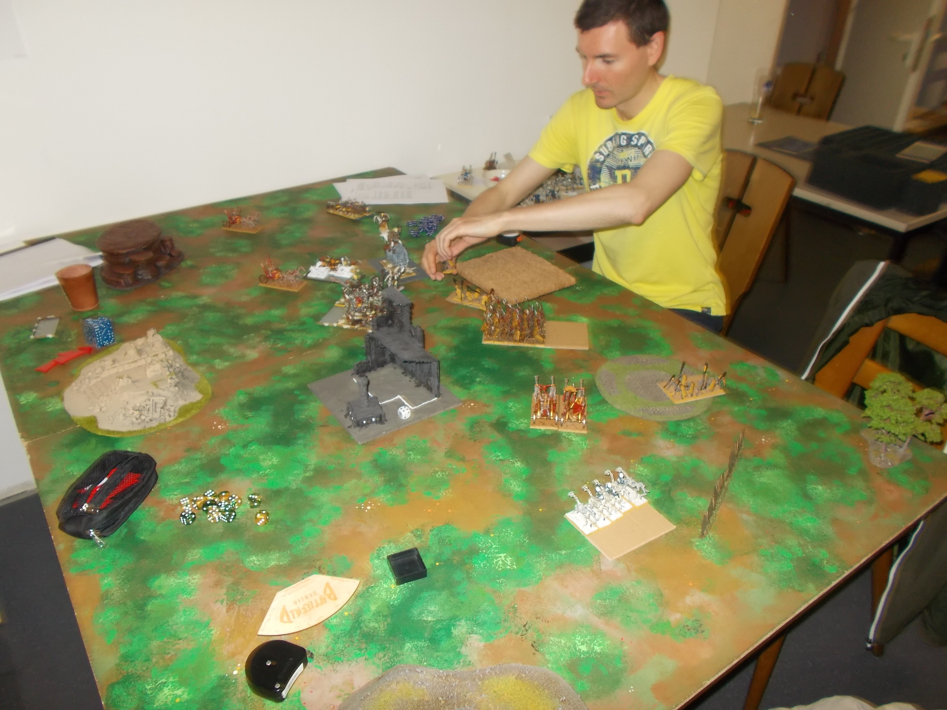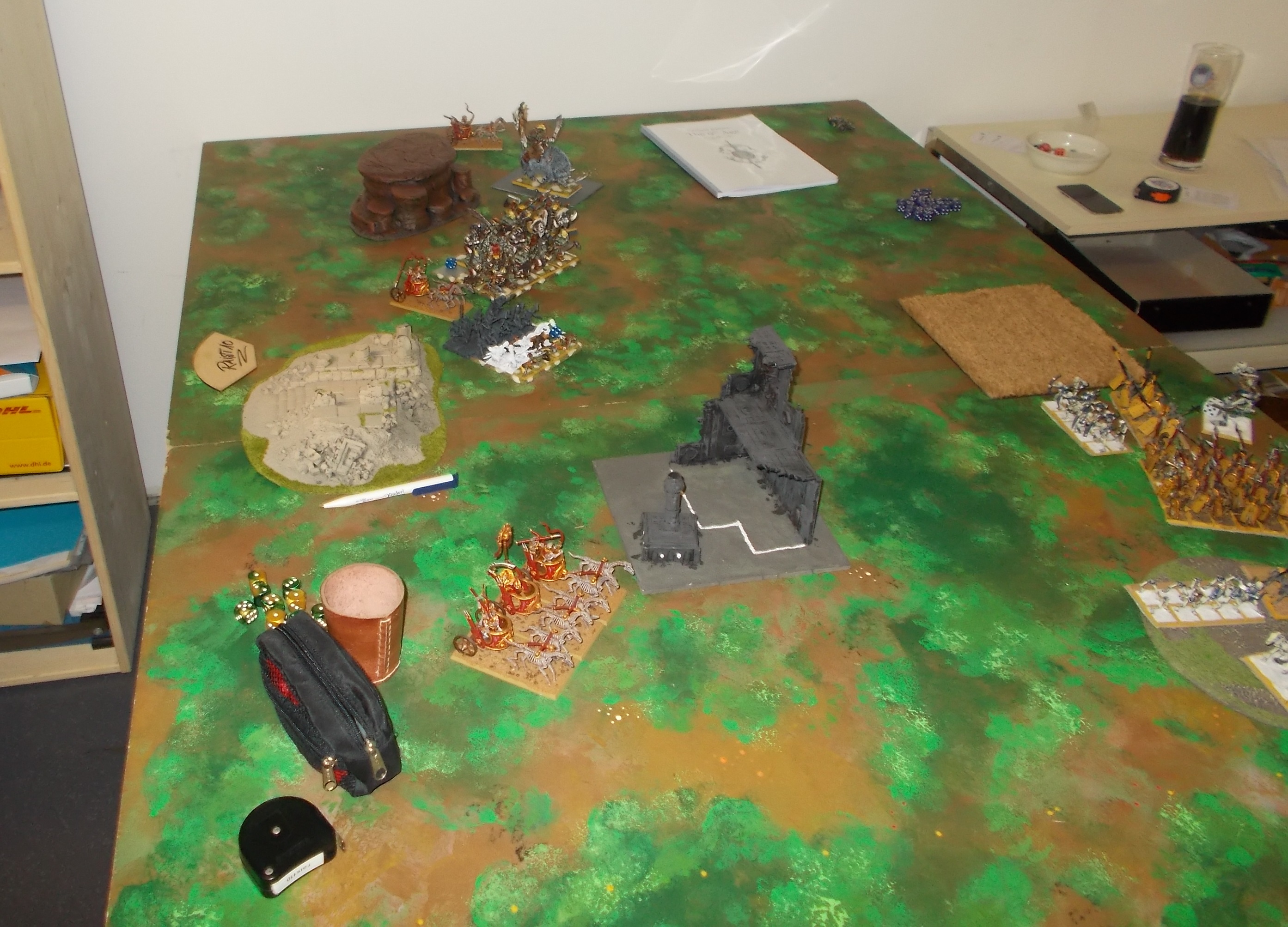 Liste siehe kurz zuvor.Gelände wurde strikt nach Regelbuch ausgewürfelt und aufgestellt, Szenario war pro Oger ... Durchbruch und ich erwürfelte Seitenwahl.