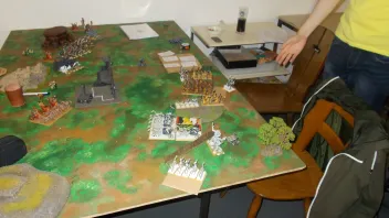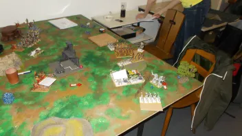 Mein Plan mit Magie und Beschuß und den Yetis den gegnerischen Beschuß schnell abzuschwächen, hat gut geklappt. Mein Zentrum eng beieinander zu halten um Paniktests sicher stehen zu können hat auch geklappt und die eine Flanke nur mit den Tuskern abzusichern, ging auch gut auf. Von daher hat der grundlegende Plan gut geklappt, auch wenn ich mir noch in der Mitte ein paar Mal selber im Weg gestanden bin ... daran muss ich wohl noch ein bisserl arbeiten.