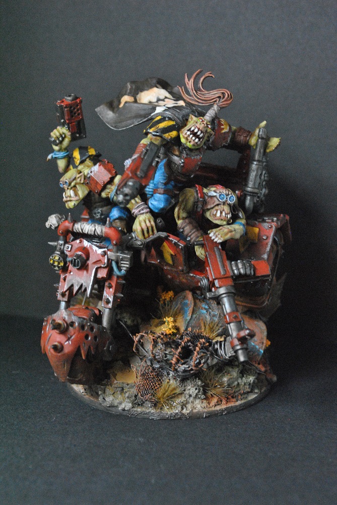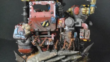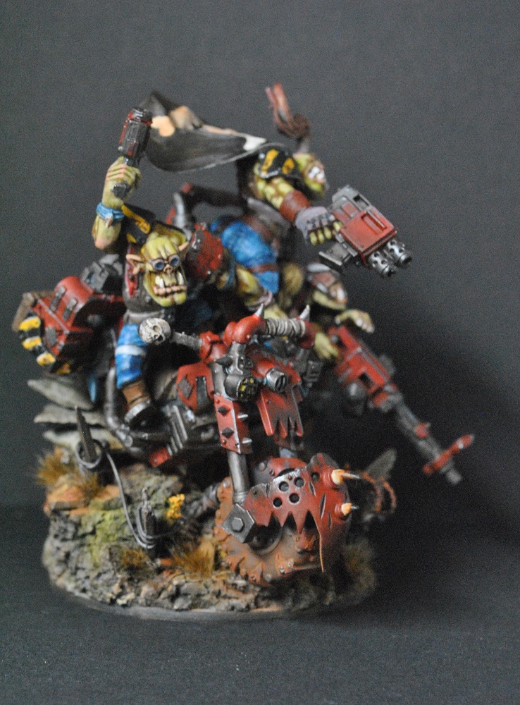 Aufgrund von Zeitmangel bin ich lediglich zwei Abende zum Malen gekommen und es sind daher nur so ca. 70% fertig geworden von dem was ich mir eigentlich vorgenommen habe. An diversen Stellen ist nicht viel mehr drauf als die Grundfarben und es soll sich noch ein Gobbo mit Jetpack am Mantel des einen Orks festklammern und Qualm aus den Auspuffrohren herauswehen. Das finale Resultat reiche ich dann bei Gelegenheit nach aber hier zunächst das "Endergebnis" fü den Wettbewerb. -