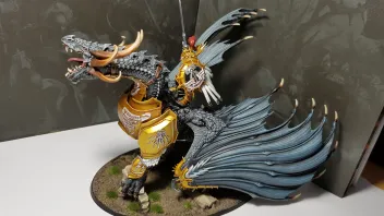 Wenn ich mir den von GW angucke finde ich der sieht jetzt groß anders aus, an den goldenen Stellen (dass meiner so viel Gold hat darf man beim Vergleich nicht vergessen!)Da am Flügel und am Bein haben sie richtig dunkle Schatten auf's Gold gemalt und es sieht gut aus. Aber realistisch ist das auch nicht.