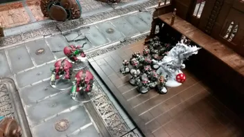 Im Gegenzug schaffte ich es in der Mitte in den NK, aber leider nicht mit den gebufften Poxwalker sondern nur mit den kleinen machte aber nix, den durch Beschuss, Psi und so hatte er bereits 8 Mann verloren, Thyphus erledigte gekonnt nochmal 5 Und so hatte er 13 Mann verloren, eine 3 beim Moralcheck und die anderen 5 waren ebenfall dahin. Die Hellbrutes regelten ganz rechts alles und räumten den Platz von aleln Extintoren und dem Cryptek leer. Selbst meine Drohnen überlebten.