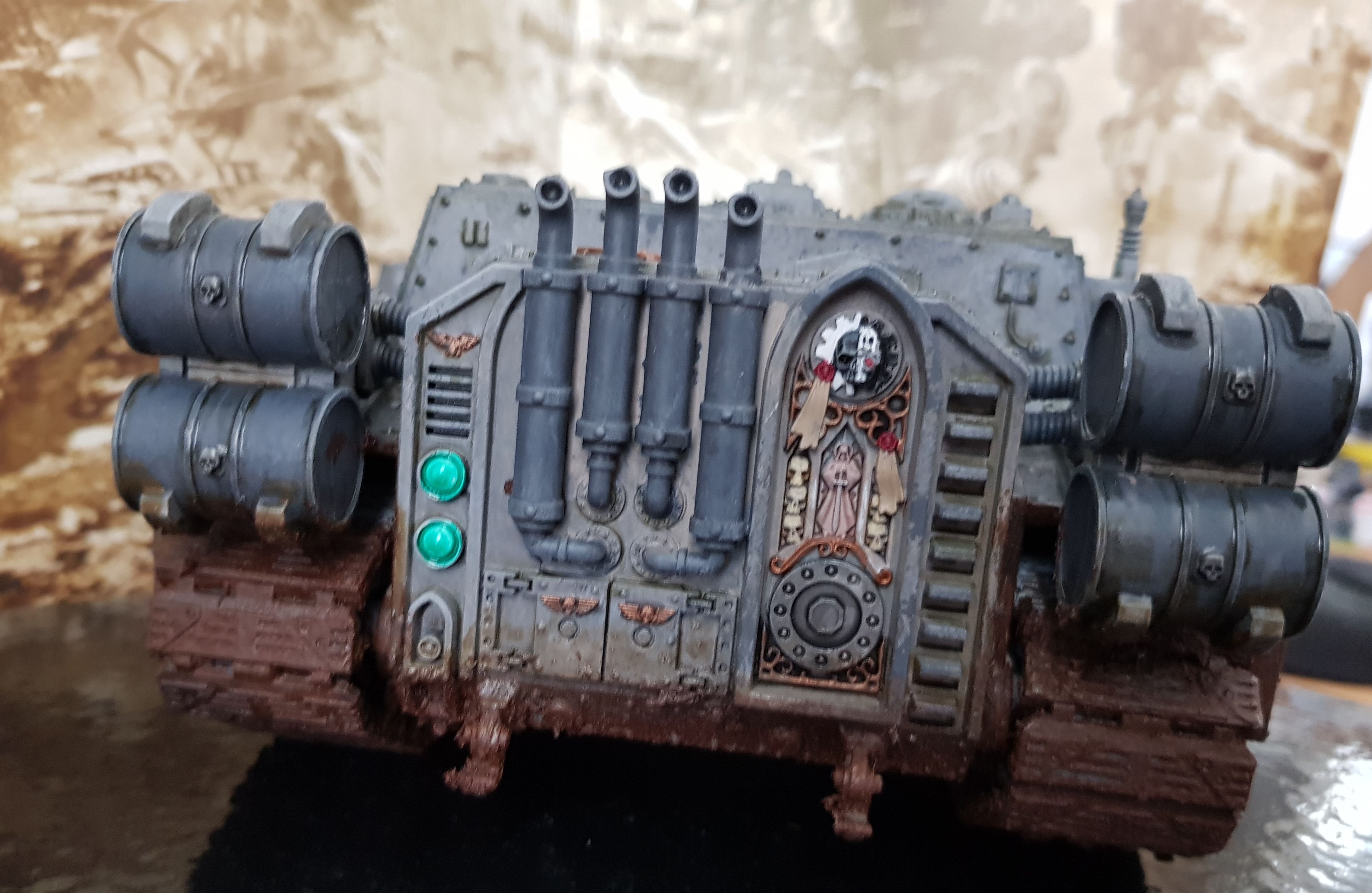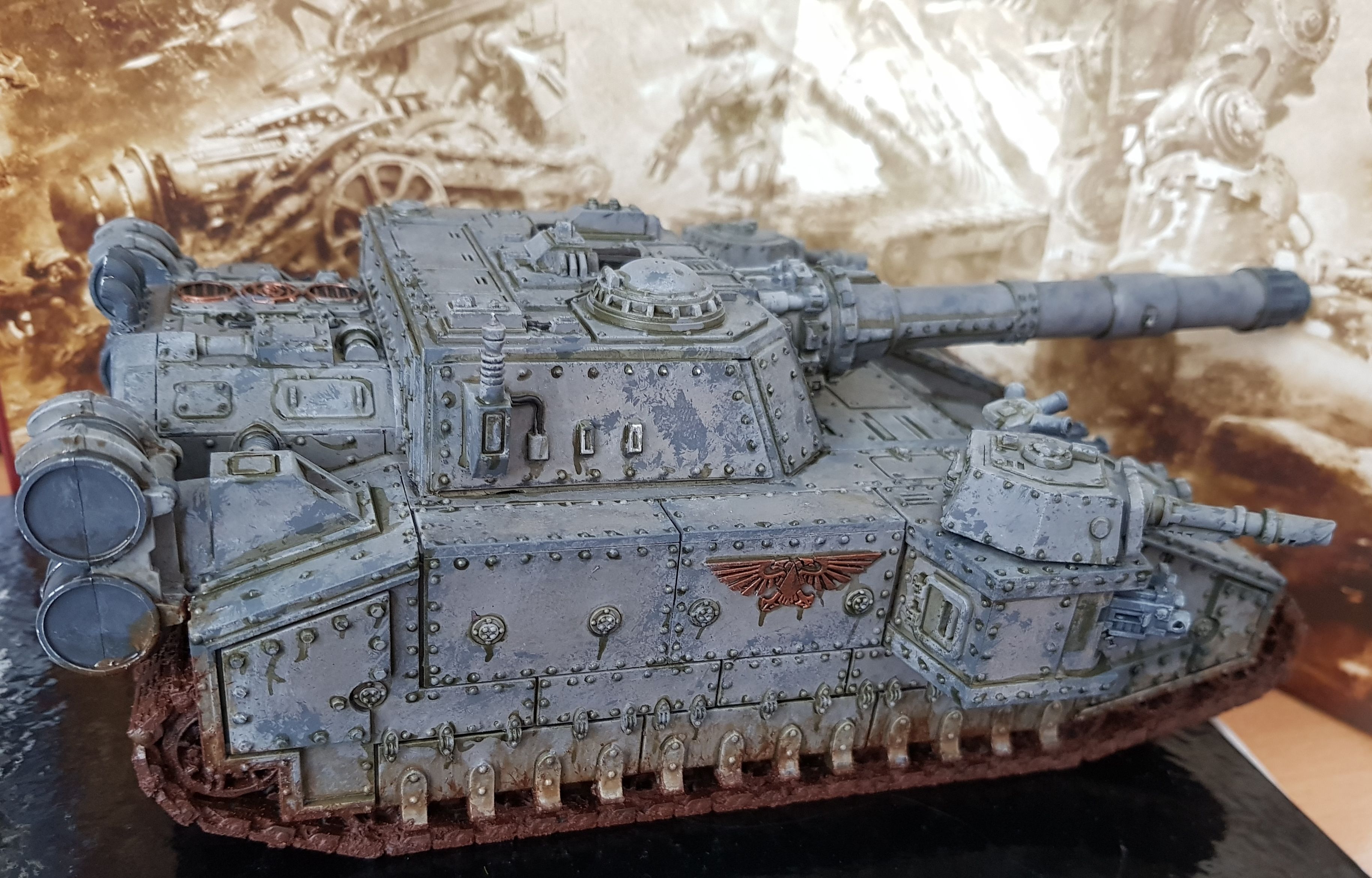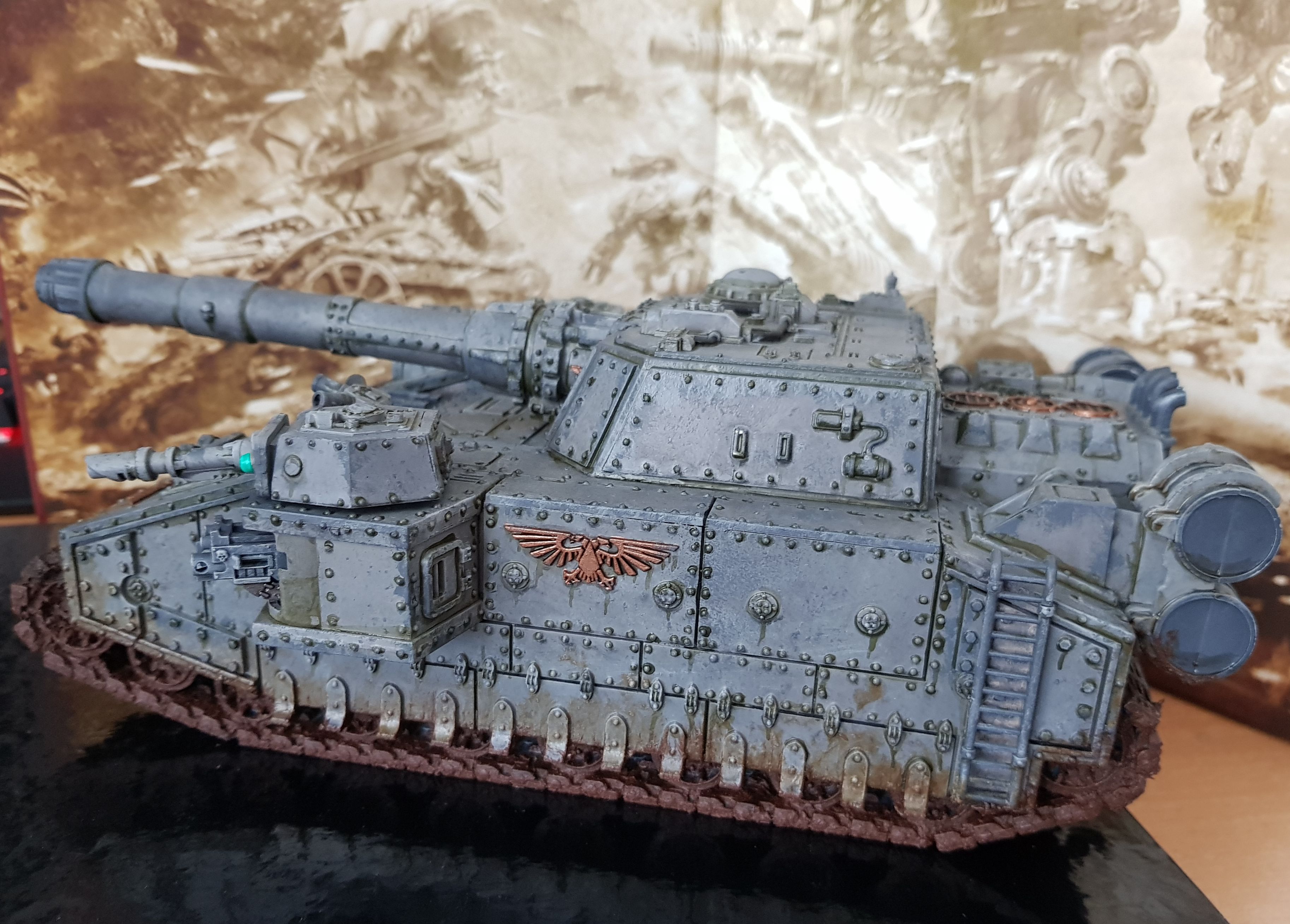 3. Geduld und sich die Mühe machen. Ich bemale jedes Modell und jede Kleinigkeit so lange bis ich zufrieden bin oder irgendwann gar keine Lust mehr habe (da gehe ich oft später nochmal drüber). Also wenn ich z.B. bei meinem Shadowsword merke, dass es viel besser aussieht, wenn jede einzelne Niete nen Tupfer streaking grime abbekommt, dann bekommt halt jede einen ab. Details machen durchaus etwas aus. Auch kleinere, weniger auffällige bei kleineren Modellen. Wenn irgendwas 20 Schichten verdünntes shade braucht um nen Übergang herzustellen, dann mache ich's halt 20 mal.