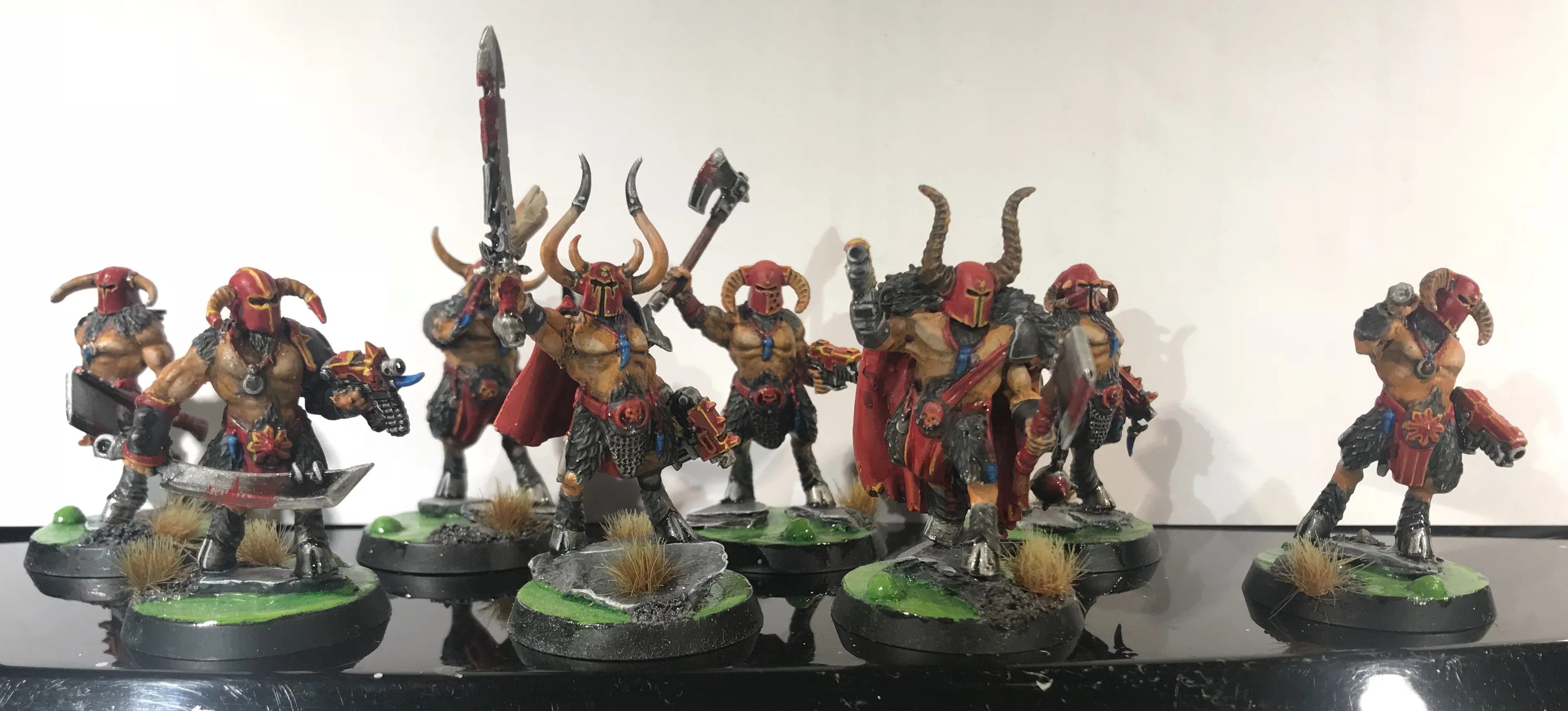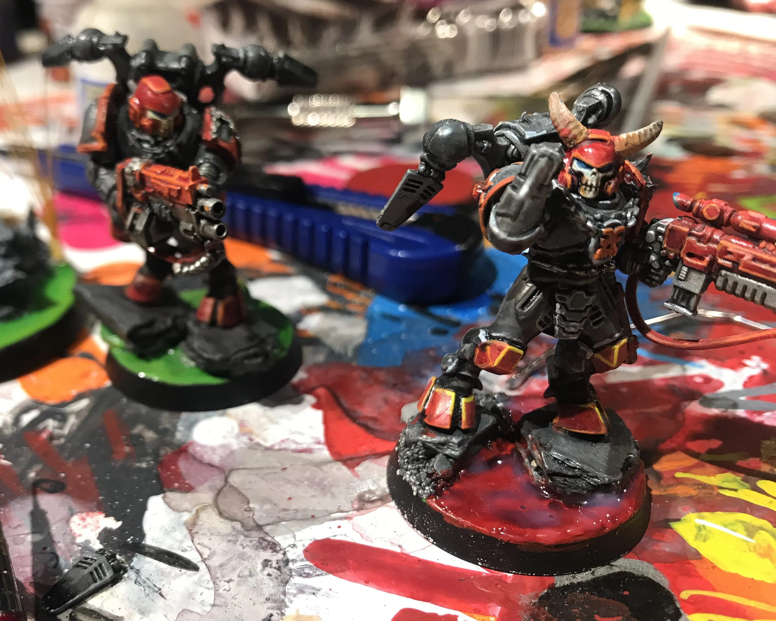 Falls nicht würde ich dir empfehlen mit Wash die Farben etwas besser zu verbinden. Sanftere Übergänge und sowas. Außerdem würde ich die blauen Energiewaffen lassen. Dadurch wirken die Modelle sehr bund und grell.Aber wenn es dir gefällt ignoriere den Nörgler.