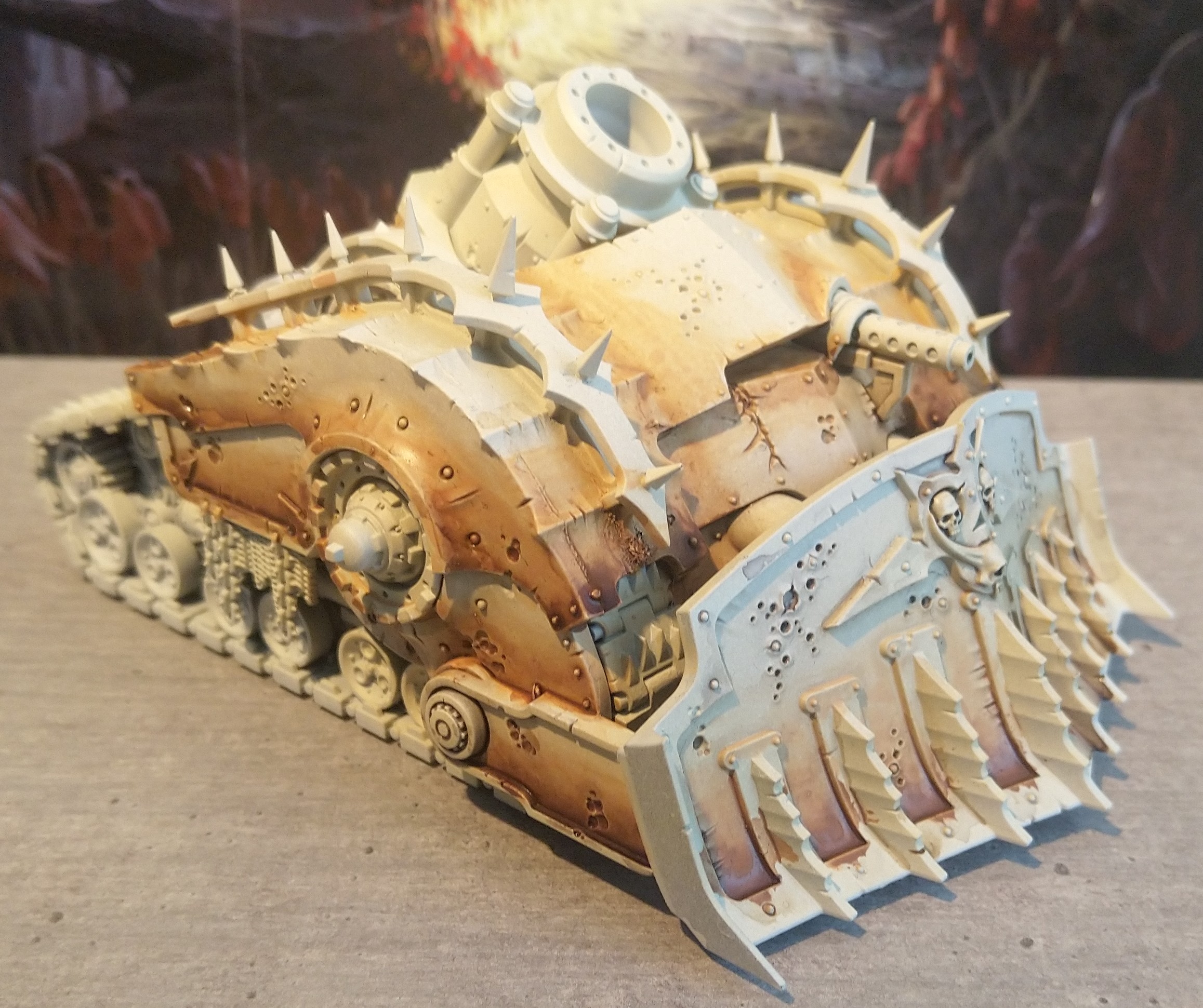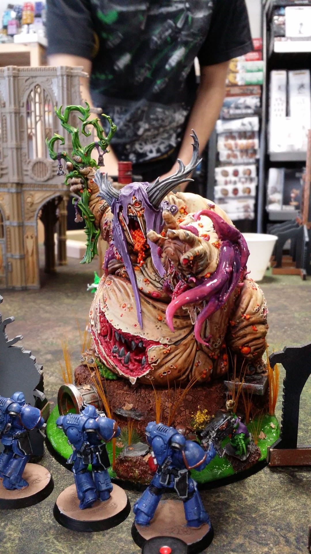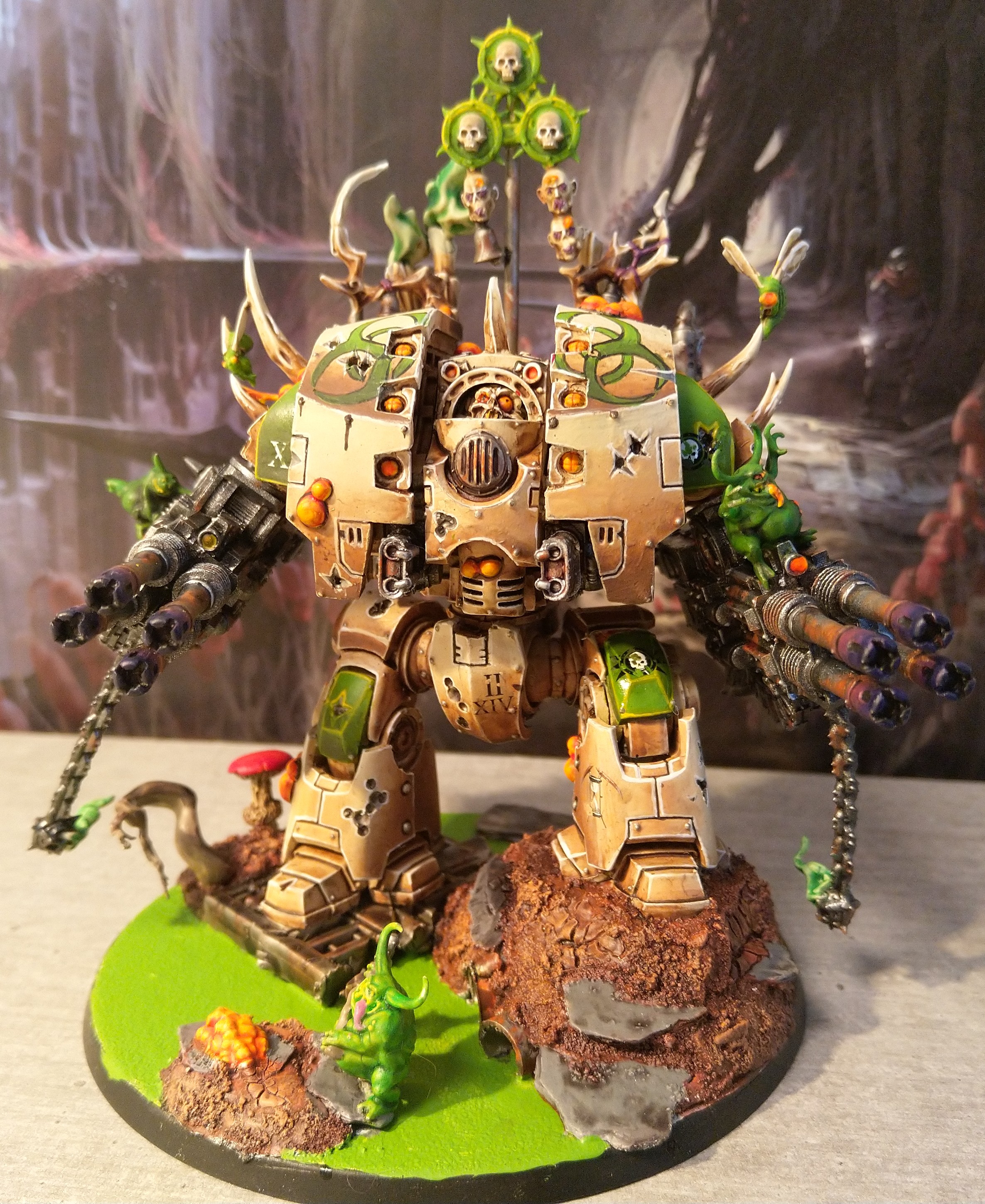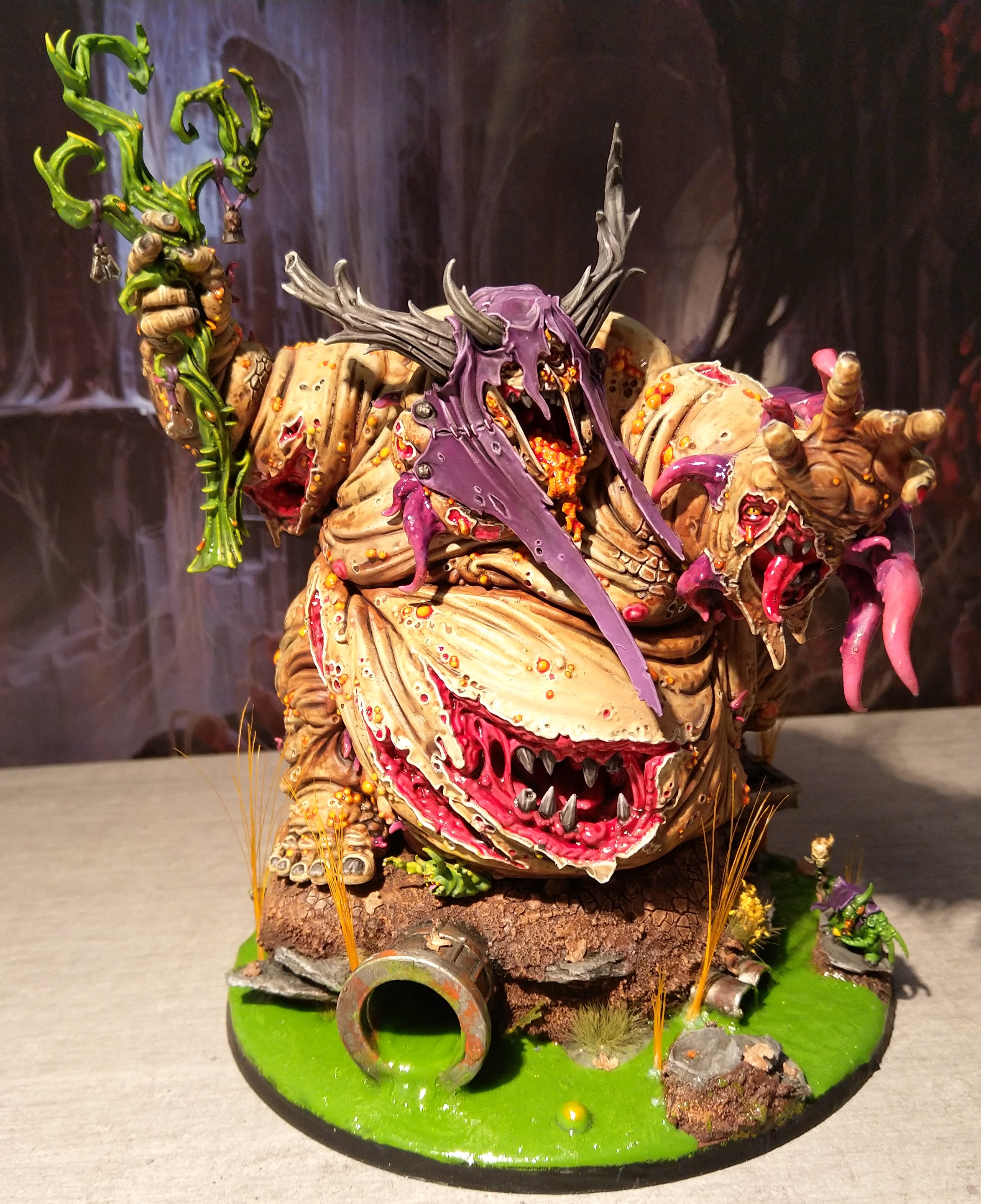 Hab mich beim Aufstellen schöne Burg gebaut, damit er in die Plaguebearer muss (schockt gerne mit den harten Jungs) und ich im nächsten Zug mit den Granatentrick ihn weghauen kann.