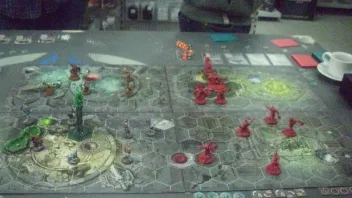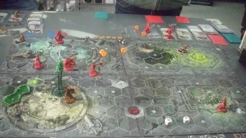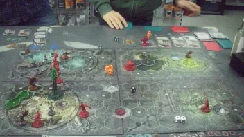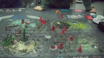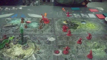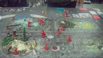 Meine Grabwache kam mit fast dem gleichen Deck wie zum Spiel letzte Woche an, was ein kapitaler Fehler war. Für ein Spiel zu zweit ist das Deck perfekt, aber bei drei Gegnern, die sich teilweise gleichzeitig auf einen stürzen, waren das Deck und auch die Grabwache einfach überfordert. Das habe ich schnell spüren müssen, als sich an drei Fronten mehr oder weniger gleichzeitig erste Geplänkel ereigneten. Das zu einer Zeit, ganz am Anfang des Spiels, den die Skelette eigentlich zur Konsolidierung ihres beanspruchten Raums und vielleicht dem Gewinn der ersten Ruhmnpunkte benötigen.