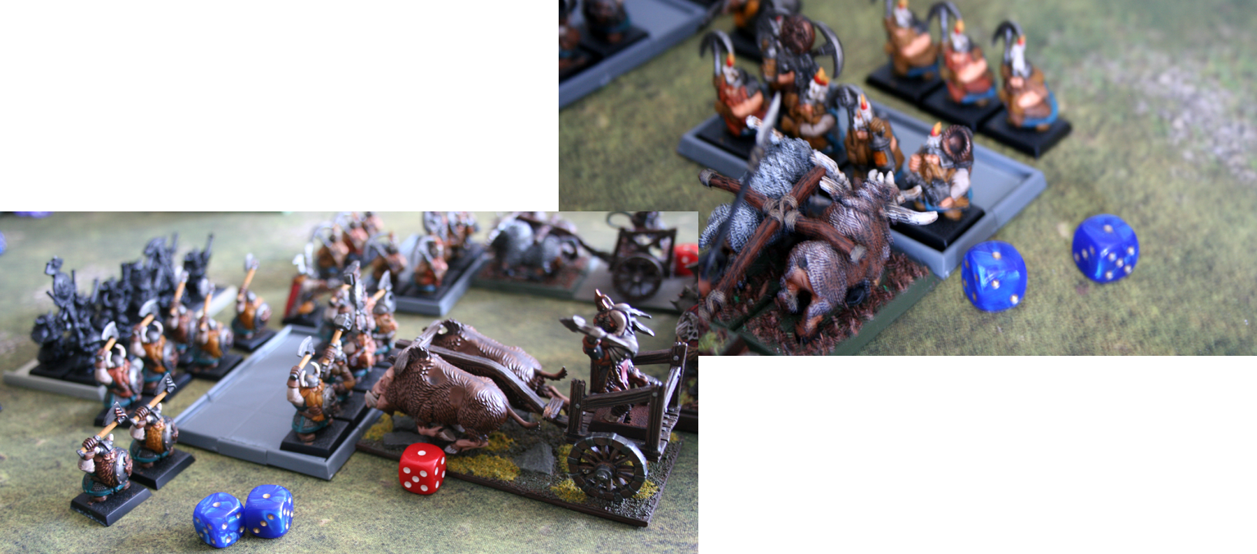 Angespornt, von den durch die Elfen angefachten Hass-Gefühlen, schlugen die Zwerge nun noch wilder auf die Behuften ein. Als ihr Befehlshaber sich schließlich selbst ins Getümmel warf, wendeten sie das Blatt und trieben die Streitwagen in die Flucht und rannten unvermittelt weiter in die dahinter lauernden Bestigors hinein.