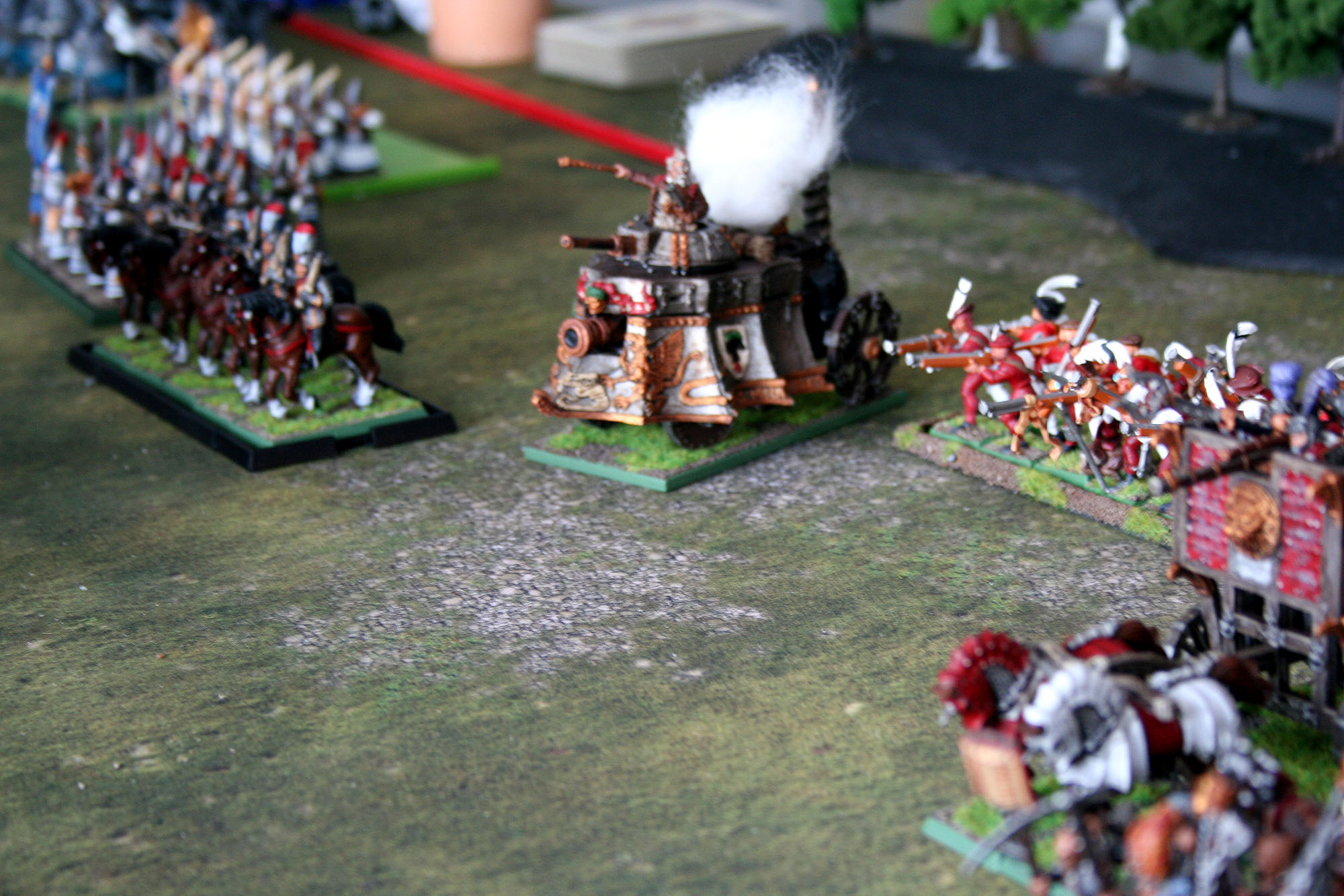 Als die Behuften schließlich geschlossen auf den Gegner zurollen - finden sich auch die Zwerge auf dem Schlachtfeld ein - um die Rechte Flanke der Allianz zu schützen.Auf Seiten der Menschen brüllt der General, ein Fürst auf seinem getreuen Greif, harsche Befehle an alle Truppenteile und die Artillerie macht sich bereit den nahenden Horden einen gebührenden Empfang zu bereiten. Doch dauert es nicht lange, da zeichnen sich dunkle Omen ab. Der Druckkessel des Dampfpanzers erhielt bereits beim Anfahren einen Haarriss und Dampf trat unkontrolliert aus, sodass es den nebenstehenden Musketieren ganz mulmig zu Mute wurde. Der Fahrer bekam die Situation jedoch erstaunlich gut in den Griff und positionierte sein Gefährt neu, für einen Schuss aus der Bordkanone.