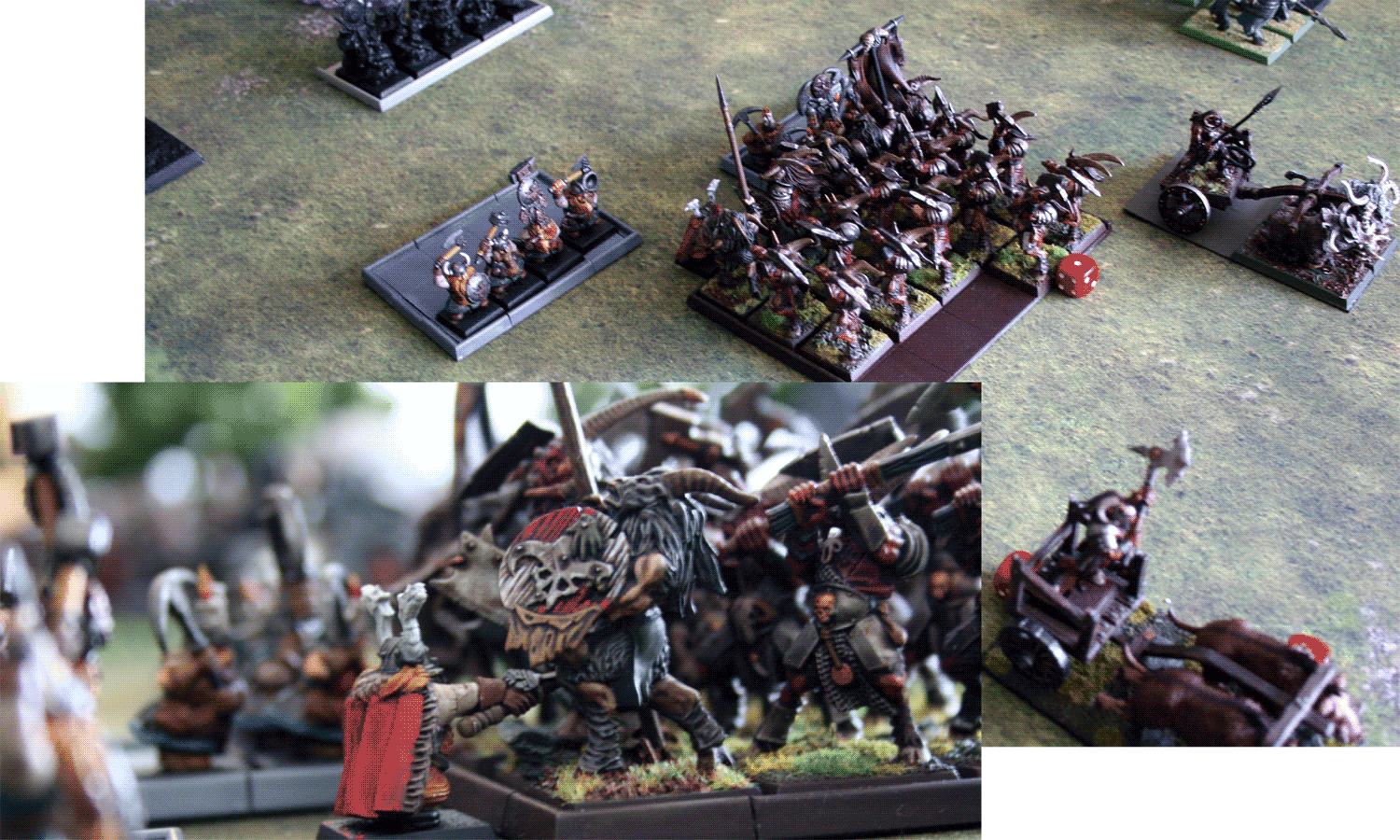 Die Götter sind dem Kopfjäger hold. Der Großteil der Herden schart sich hinter ihm. Seine Moral (10) wächst und strahlt auf die Truppen zurück. Ghoron führt lediglich sein eigenes Rgiment, sowie Ghorhoks Streitwagen. Hurrlok führt ebenfalls nur sein eigenes Regiment. Morghur führt seine Anhänger regulär ins Feld.