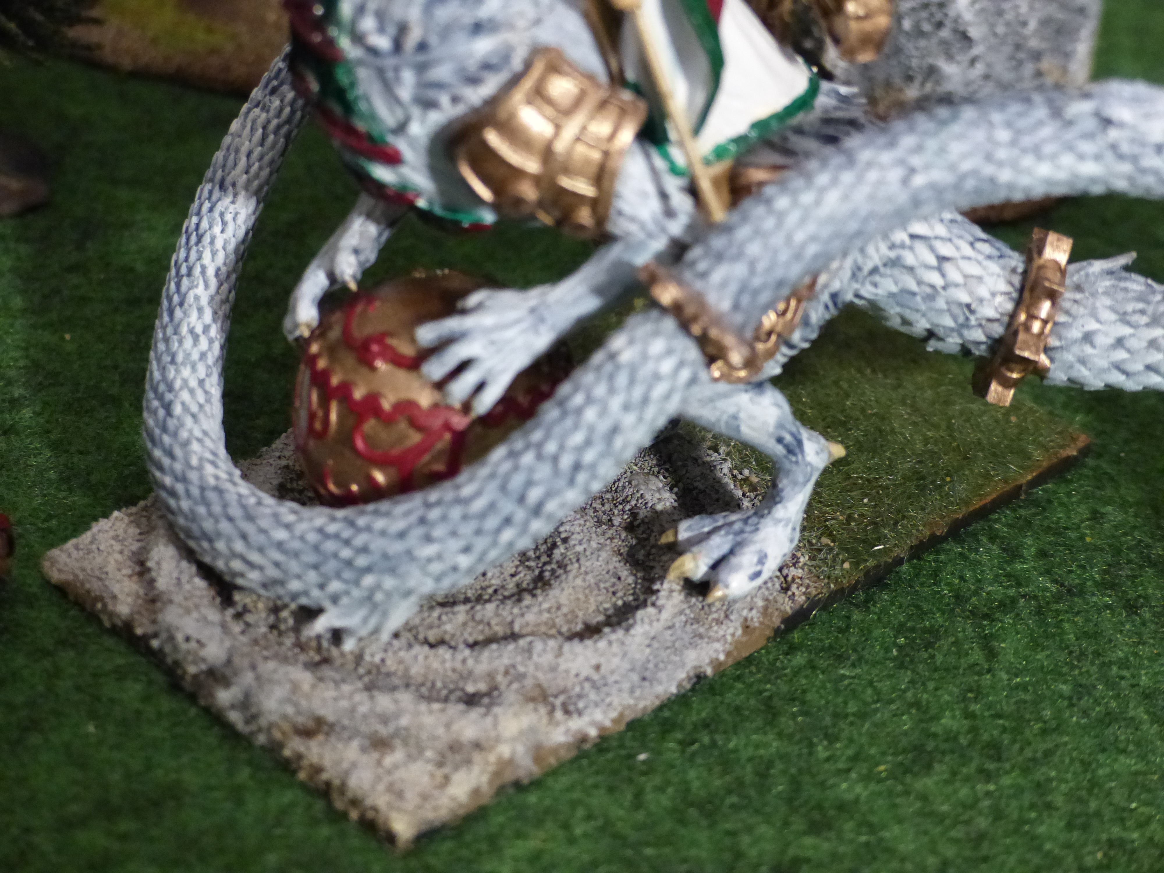 Die Armee wird größtenteils aus den Miniaturen des Dragon Empires von Titan Forge gebaut, die ich vor wenigen Tagen bestellt habe. Bis dahin habe ich mich an eine Magierin auf Drachen von Confrontation (schönes, aber qualitativ schlechtes Modell: Reiterin ist au den Drachen gegossen und hat keinerlei Konturen im Gesicht) sowie einen meiner Goblins aus der Goblin-Teezeremonie (ebenfalls von Confrontation glaube ich) gewagt. Das hier sind die Ergebnisse:![]()