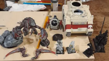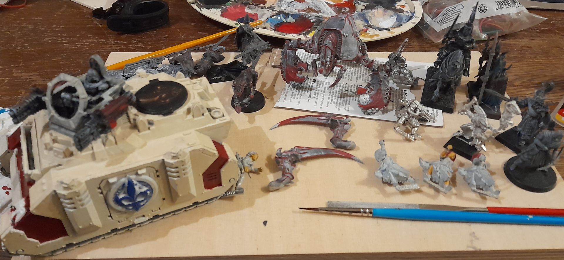 Heute habe ich nicht soviel gemalt. Nur die grundierten Modelle trockengebürstet und angefangen einen Imolator der Sororitas zu restaurieren. Da ist noch nicht viel zu sehen. Gründe dafür sind, 1. das ich heute Überstunden schieben durfte (Elterngespräche) und 2. das heute die ersten Bücher für TOW angekommen sind. Das Regelbuch, Forces of Fantasy und Arcane Journal Tomb Kings of Khemri sind da. Ravening Hordes ist bestellt und das Arcane Journal Bretonia werde ich bestellen, wenn ich es finde.