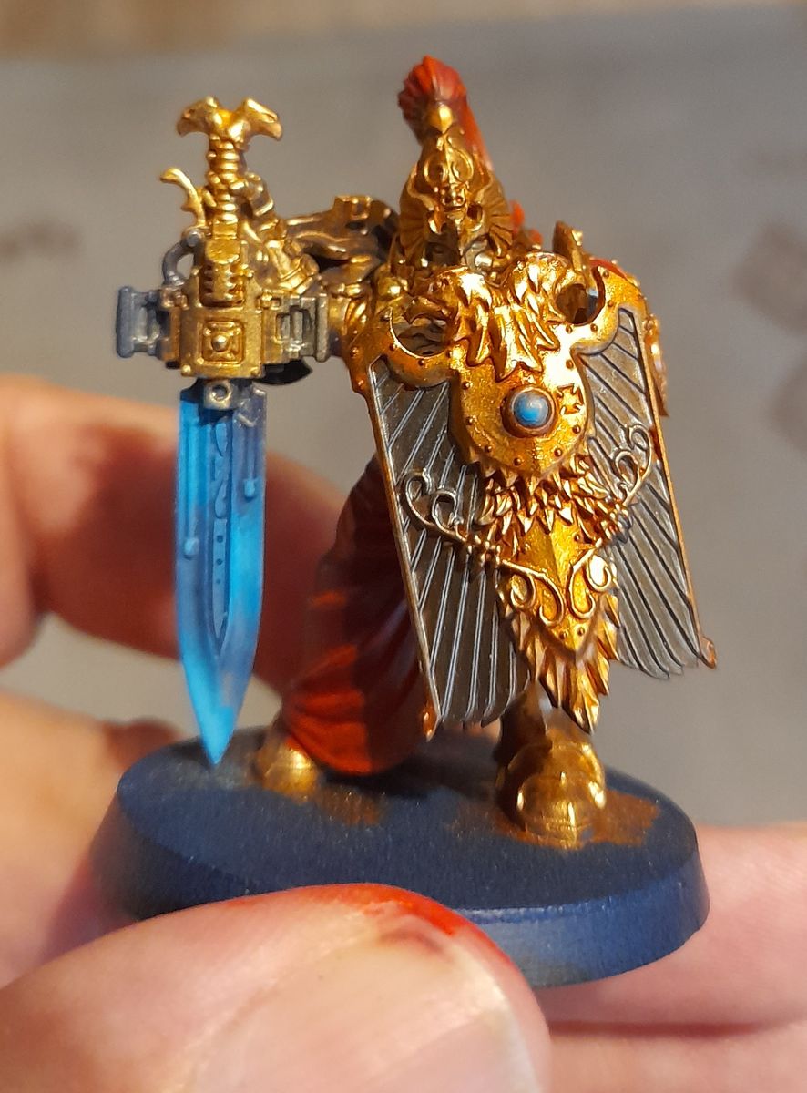 Sehr schönes Schwert! Mir gefallen auch die Ernergieschwerter mit Blautönen am besten. Ist ein schöner Kontrast zum warmen Goldton der Rüstungen. Vielleicht kannst du beim Verfeinern noch ein paar Äderchen in einem sehr hellen Blauton draufzaubern. Dann verstärkst du noch den Eindruck von Energieentladungen. Hier gibts was gannz ähnliches als Beispiel. Sind zwar Necronsaber der Effekt ist der gleiche. Necron Energiewaffen