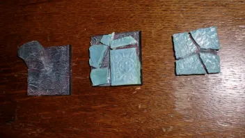 ). Die Kacheln bestehen aus Dentalgips und wurden mit Hist Arts Formen gegossen. Die fertigen Kacheln habe ich dann mit verschiedenen Werkzeugen "vorsichtig" kaputt gemacht und aufgeklebt. Nach einer kurzen Internetrecherche entschied ich mich für grünen Marmor und bemalte die Bases.Die ersten Farbschichten (leider mit Blitz aufgenommen)