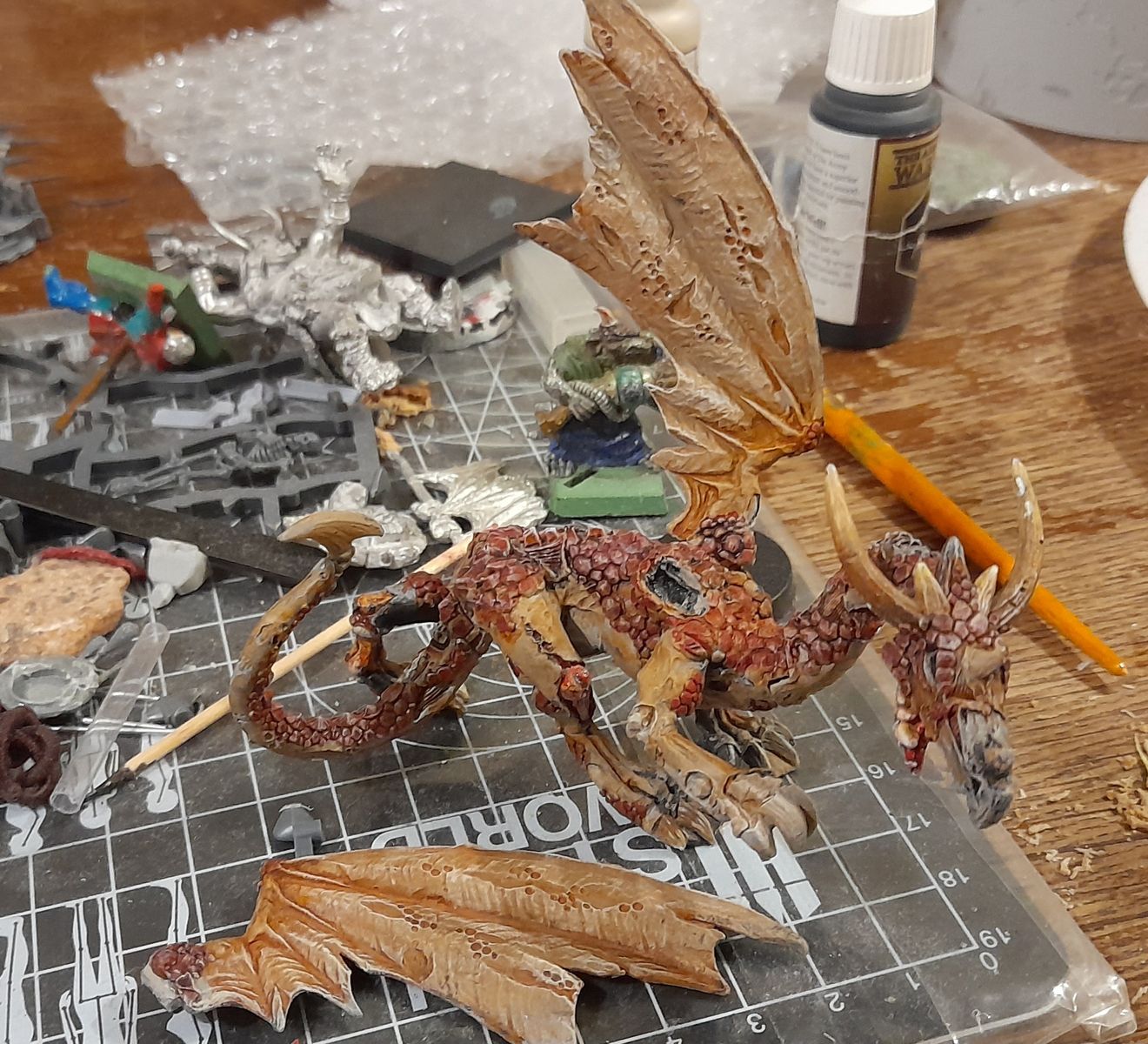 • Momentan hat mich der Arbeitsstress, aka Krankenstand auf der Arbeit, sowie ein beginnender Infekt, fest in der Hand. Deshalb war ich nicht wirklich produktiv beim bemalen der Minis. Tatsächlich habe ich fast nur Kleinigkeiten ausgebessert. Ein Wash hier, ein Shade da, nichts weltbewegendes. Allerdings habe ich angefangen meinen alten Zombiedrachen anzumalen. Das Modell ist alt (WFB 4. Edition), aber es gefällt mir ausgesprochen gut. Es ist komplett aus Metall (für mich ein gewaltiger Pluspunkt) und es hat einen ausmodellierten Körper, etwas was mir bei den meisten anderen Drachen gefehlt hat (ich stehe nicht so auf Schlangenkörper, an die man Arme, Beine und Flügel getackert hat). Der Drache war schwarz, mit frischen Wunden. Er sah nicht mal schlecht aus, weshalb ich ihn nie angerührt habe. Dennoch musste er jetzt dran glauben, da ich ihn selber bemalen möchte.