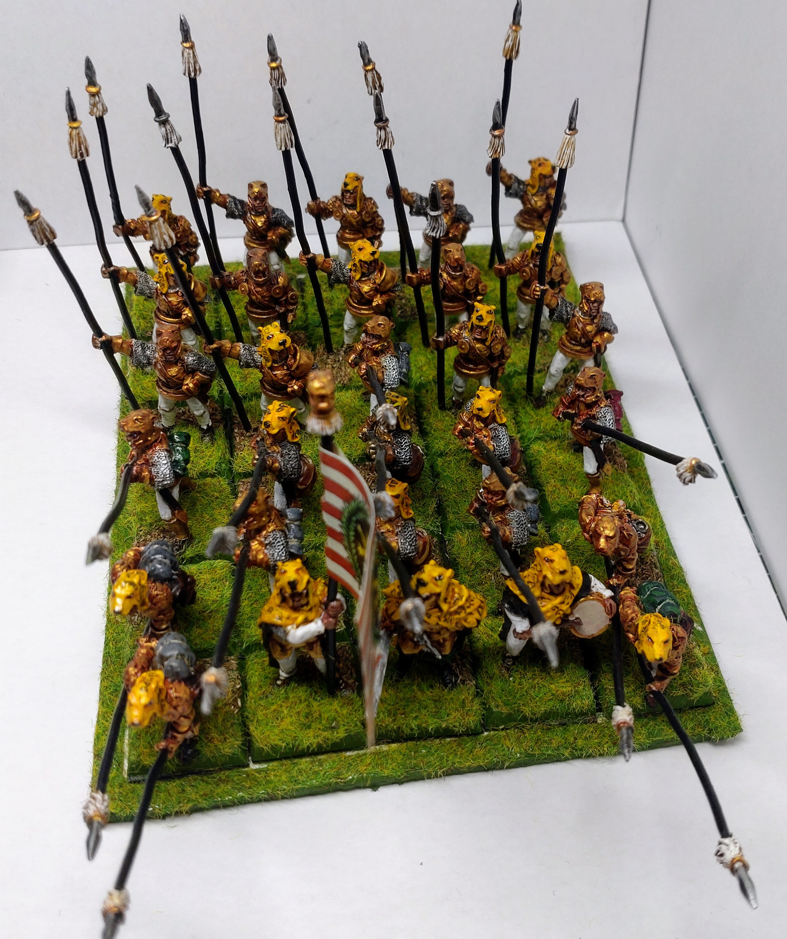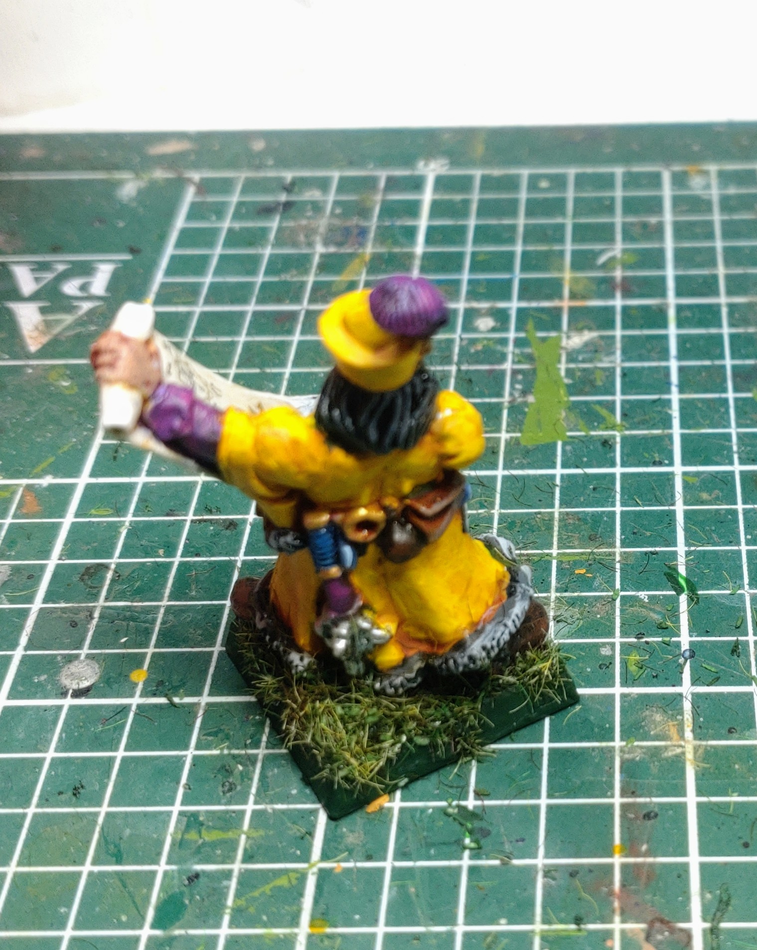Lange ist es hier leider nicht weiter gegangen, aufgrund Gesundheitszustand und viel Zeit mit dem Kindern. Aber langsam ist Mal wieder ab und an etwas Luft für das Hobby. Nachdem ich im November meine Platte endlich fertig hatte und ein bisschen Gelände begonnen hatte, sind Anfang des Jahres fünf Seegardisten fertig geworden und der 40er Block somit perfekt. Außerdem als "Fingerübung" zum Warmwerden nachfolgender Charakter -Aloisius Kupferfeld, Goldzauberer: