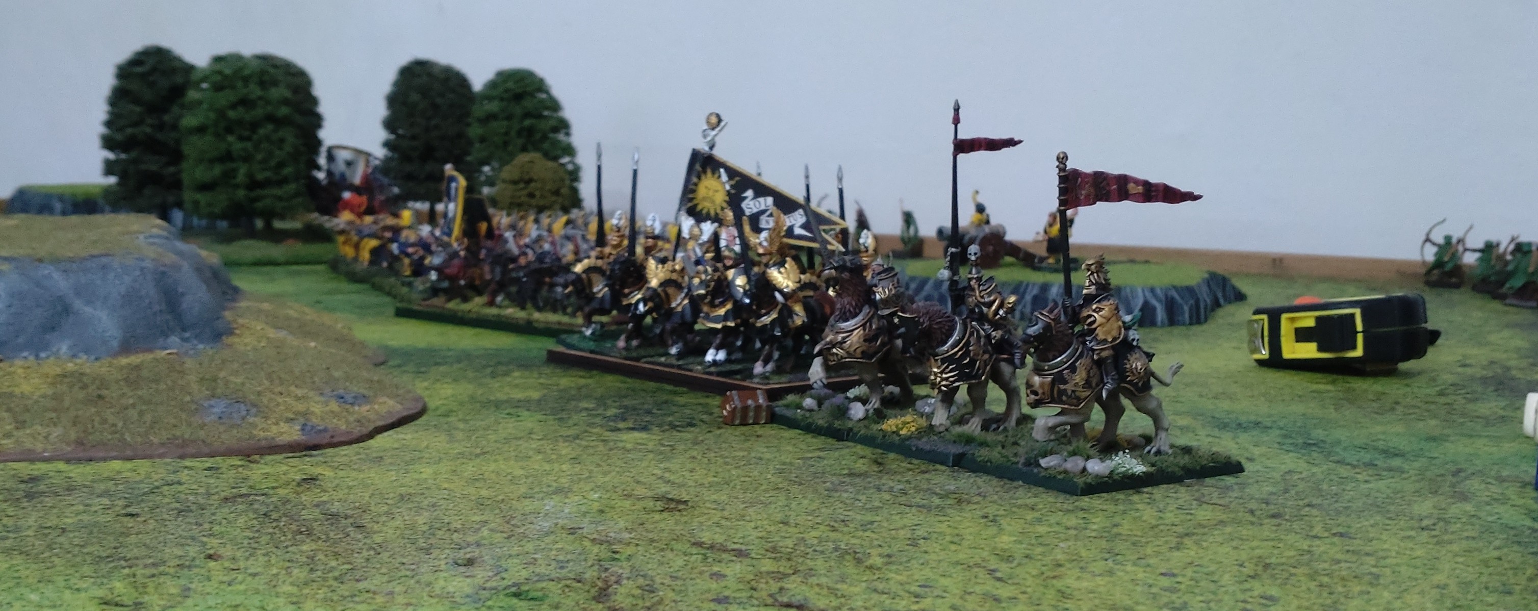 Zwei Bannwürfel übrig. Mit einem einem "Ich glaube nicht, dass ich es es schaffe, aber aus Prinzip probiere ich es..." setzte mein MAgier zum Bannen an und siehe da: zwei sechsen. Gebannt Glücksgefühle können aber sehr kurzlebig sein. Die Hellbarden wurden durch konzentrierten Beschuss vom Spielfeld gejagt, ohne dass sie auch nur einen Nahkampf gesehen hätten. Also zumindest von nahem... Aus der Ferne konnten sie immerhin den Sonnenorden beim Holzhacken zusehen....