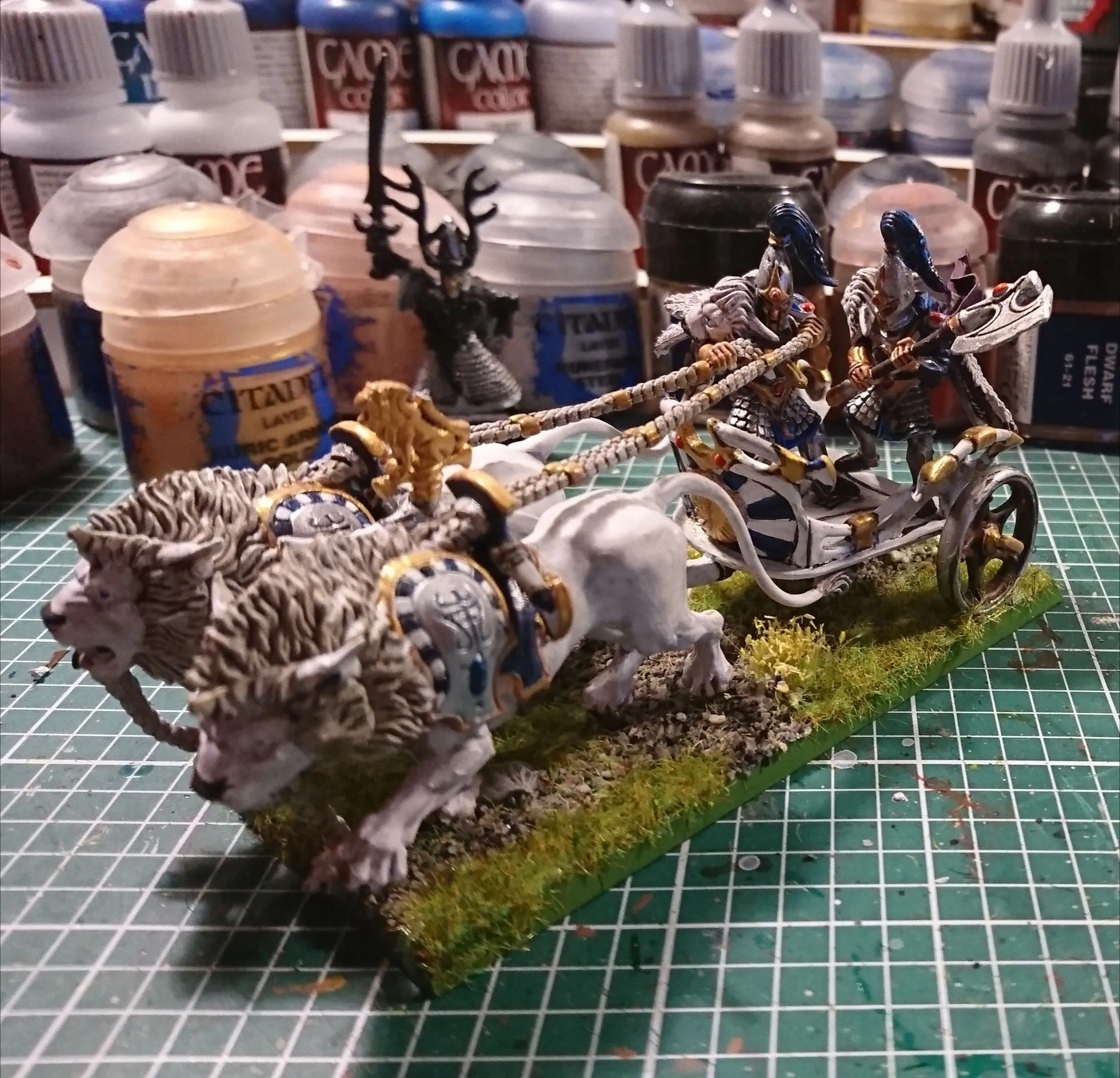 • Endlich mal wieder etwas Zeit fürs Hobby gefunden. Hochelfenstreitwagen (bis auf das Banner) fertig bekommen