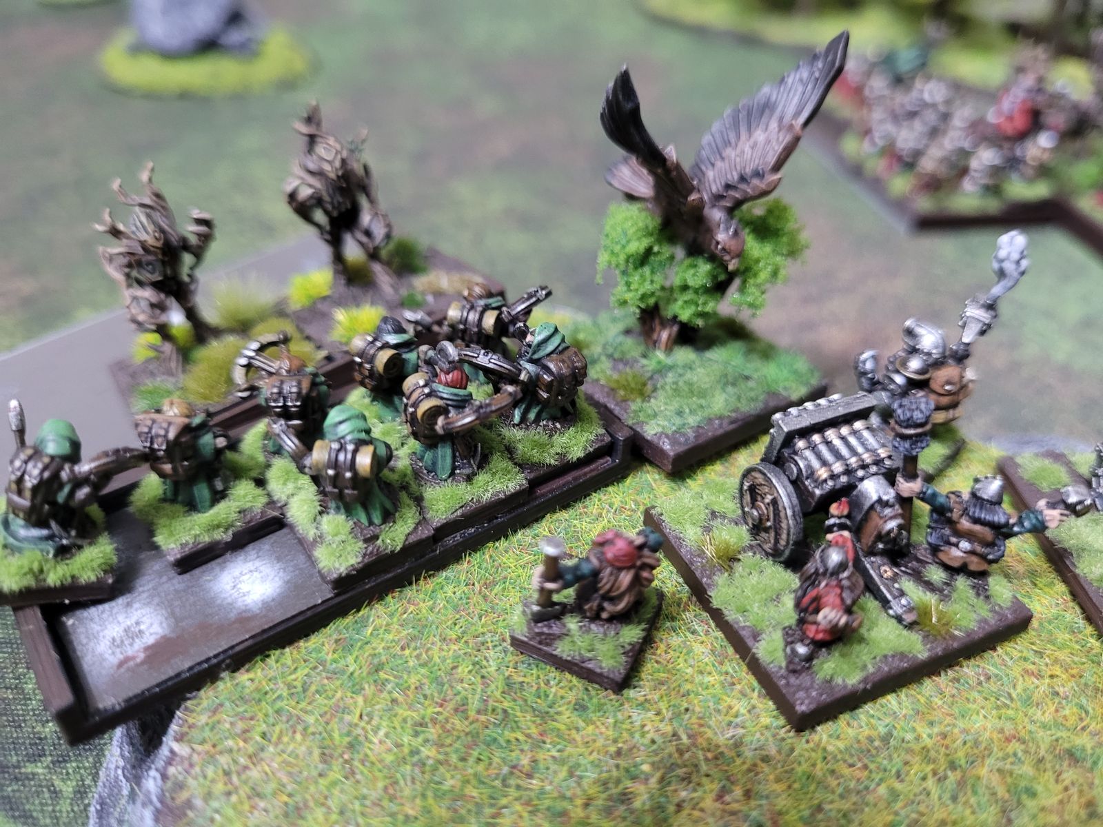 Die dritte und vierte Runde liefen nach ähnlichem Muster ab. Im Rücken der Kanonen erklärten die Eisenbrecher einen Angriff auf die Waldreite, welche ganz Elf die Beine in die Hand nahmen und bis spielende auch nicht mehr losliessen. Die Kanonen zerlegen die Baummenschen. Die Musketen schossen den Waldreitern zur Strafe für die feige Flucht in den Rücken. Die Schrate und der verbliebene schräge Vogel suchten mit mäßigem Erfolg die Nahkämpfe.