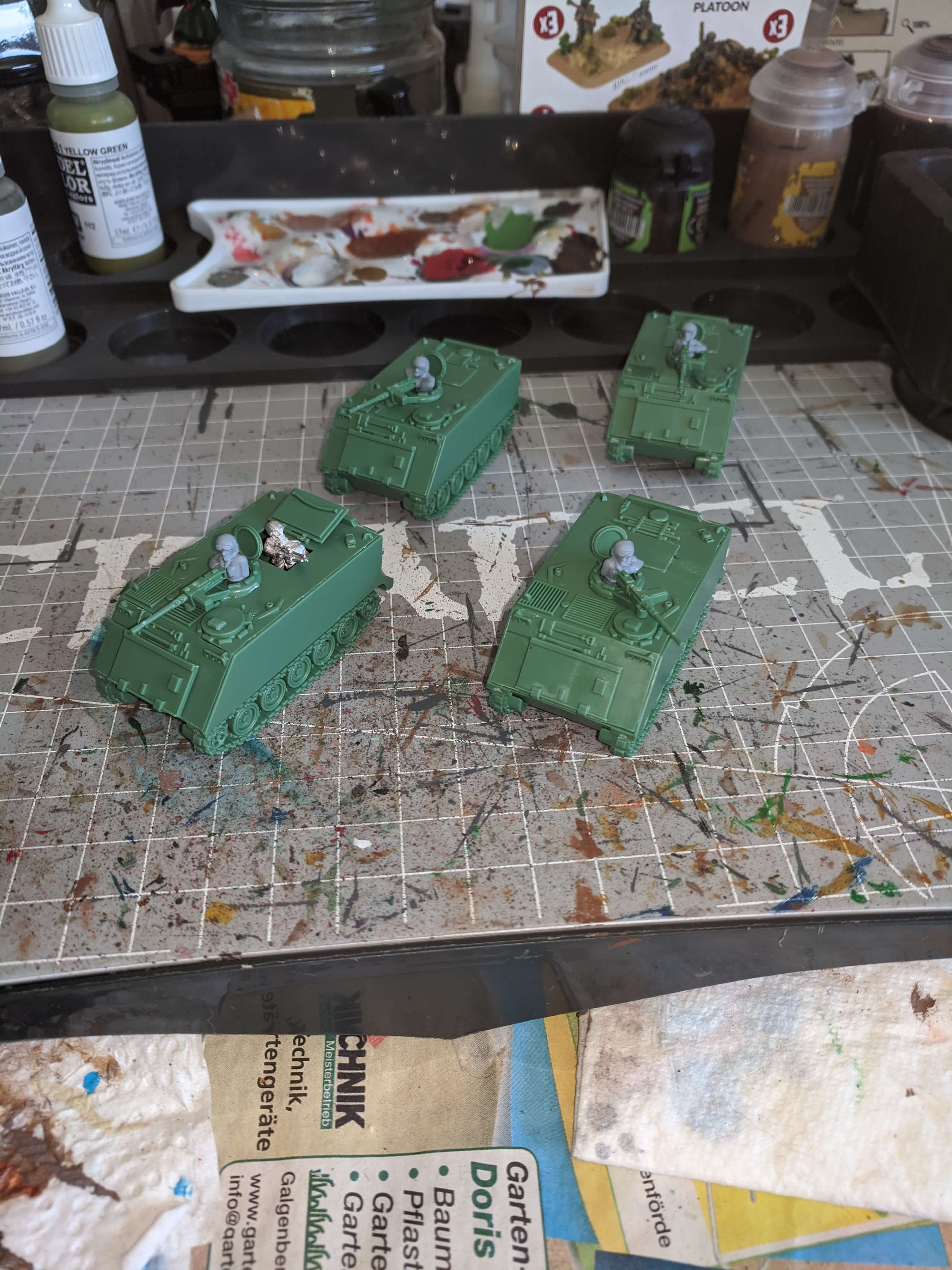 M113 Transporter, zusammengebaut, grundiert und den 1. fastfertig bemalten. Es fehlen natürlich noch diverse Decals: