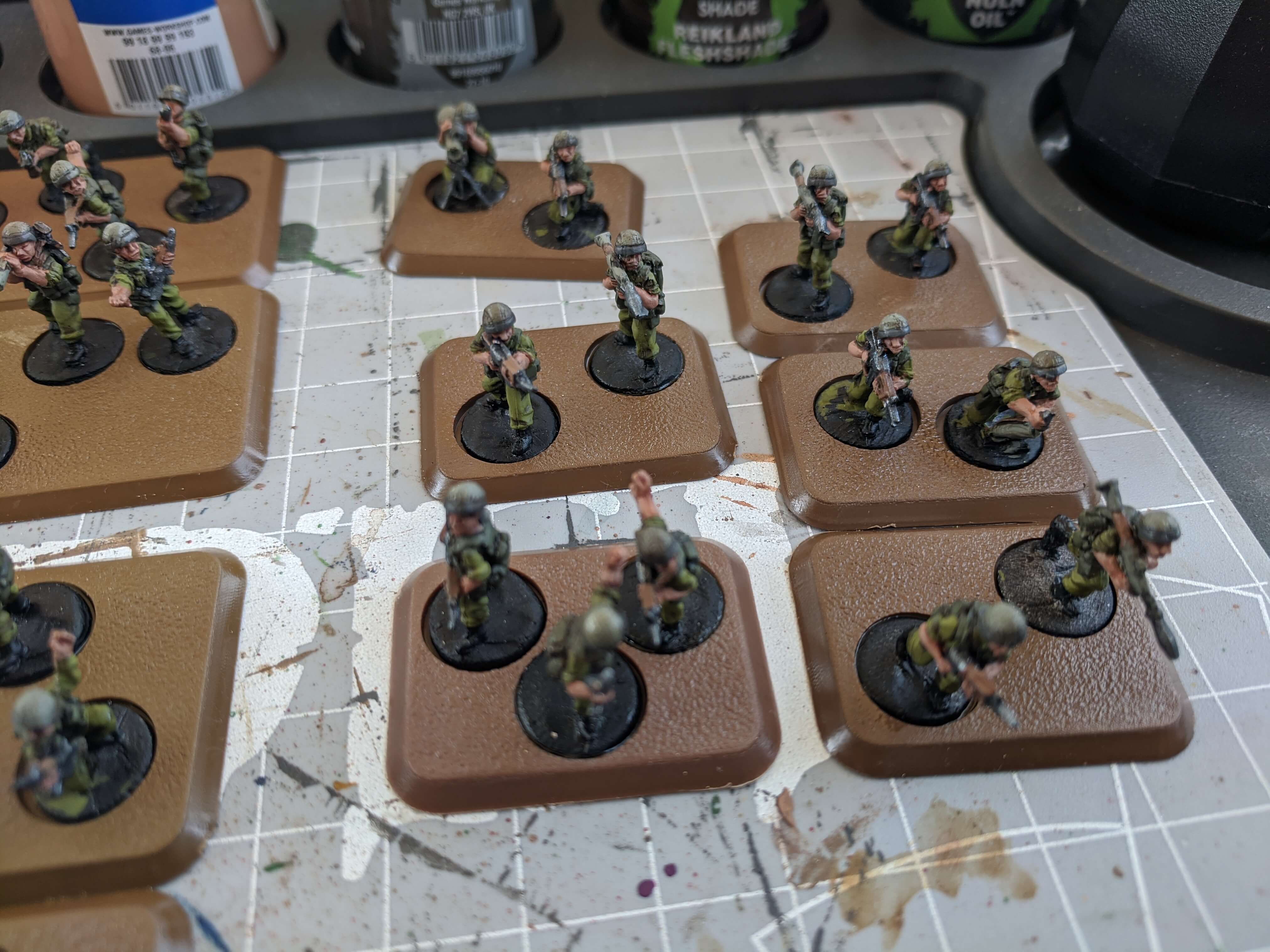 Zurzeit arbeite ich am zweiten Platoon der ersten Kompanie. Danach folgen deren Transporter und Unterstützungseinheinheiten (bereits grundiert).