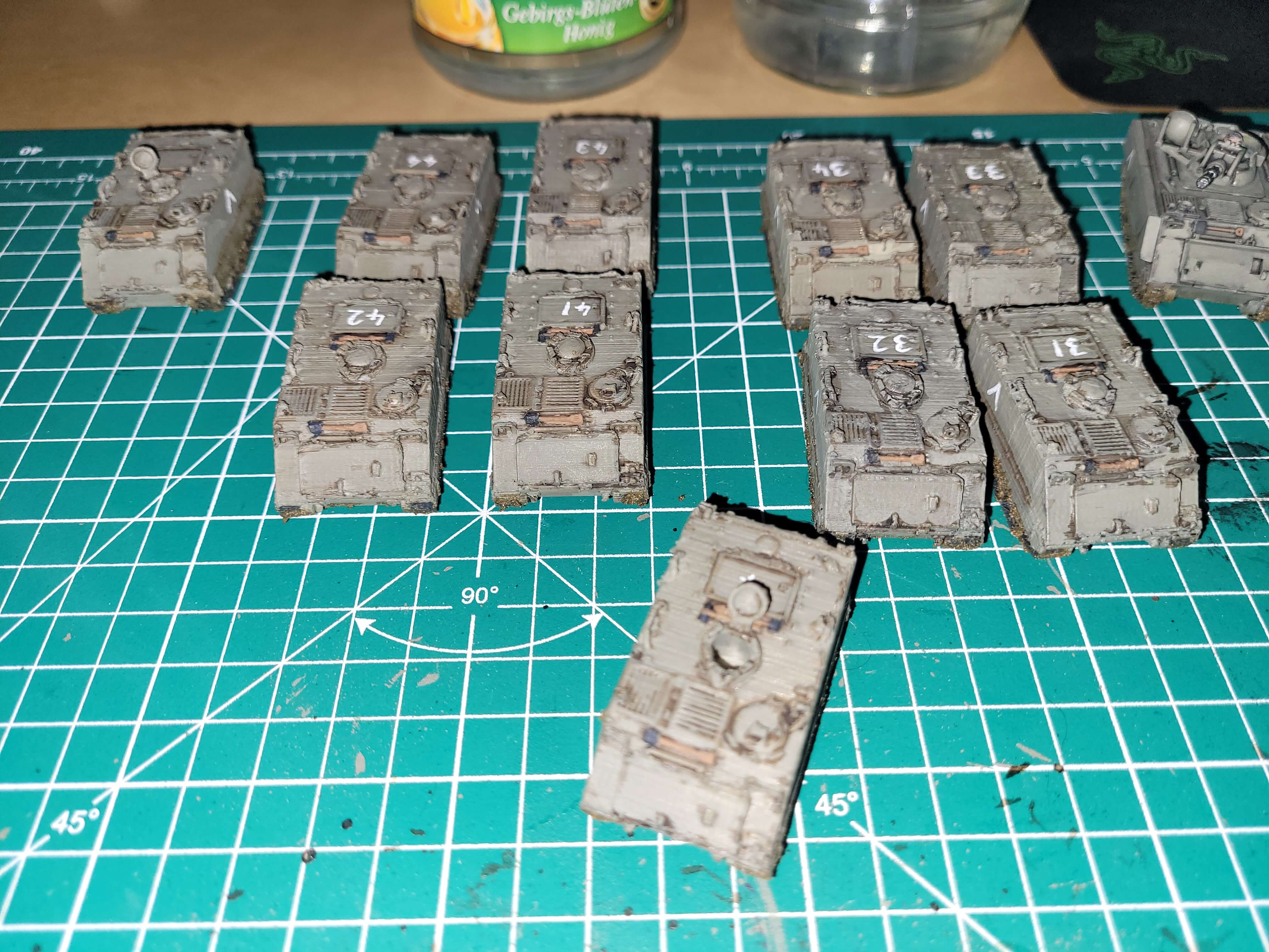 Weiter gehts mit Fahrzeugen der IDF. Ich hatte schon einige in den Monaten zuvor zusammengebaut, grundiert und zwischen den Feiertagen habe ich die letzten Transporter vom 3D-Druck entgratet (weiße M113).