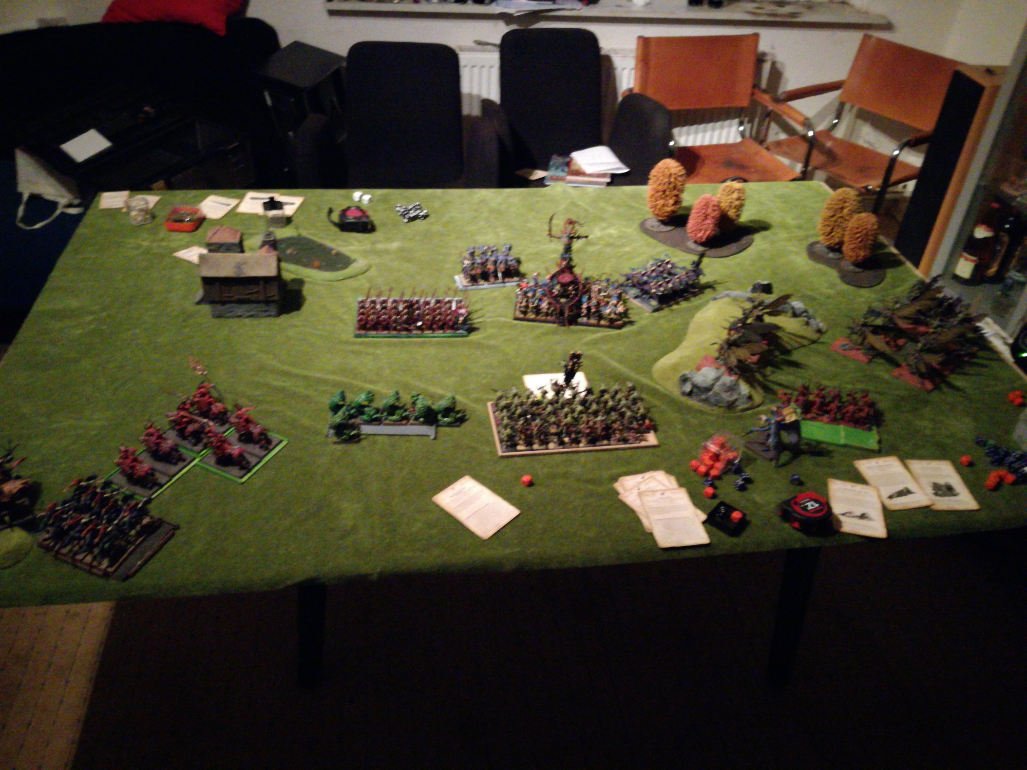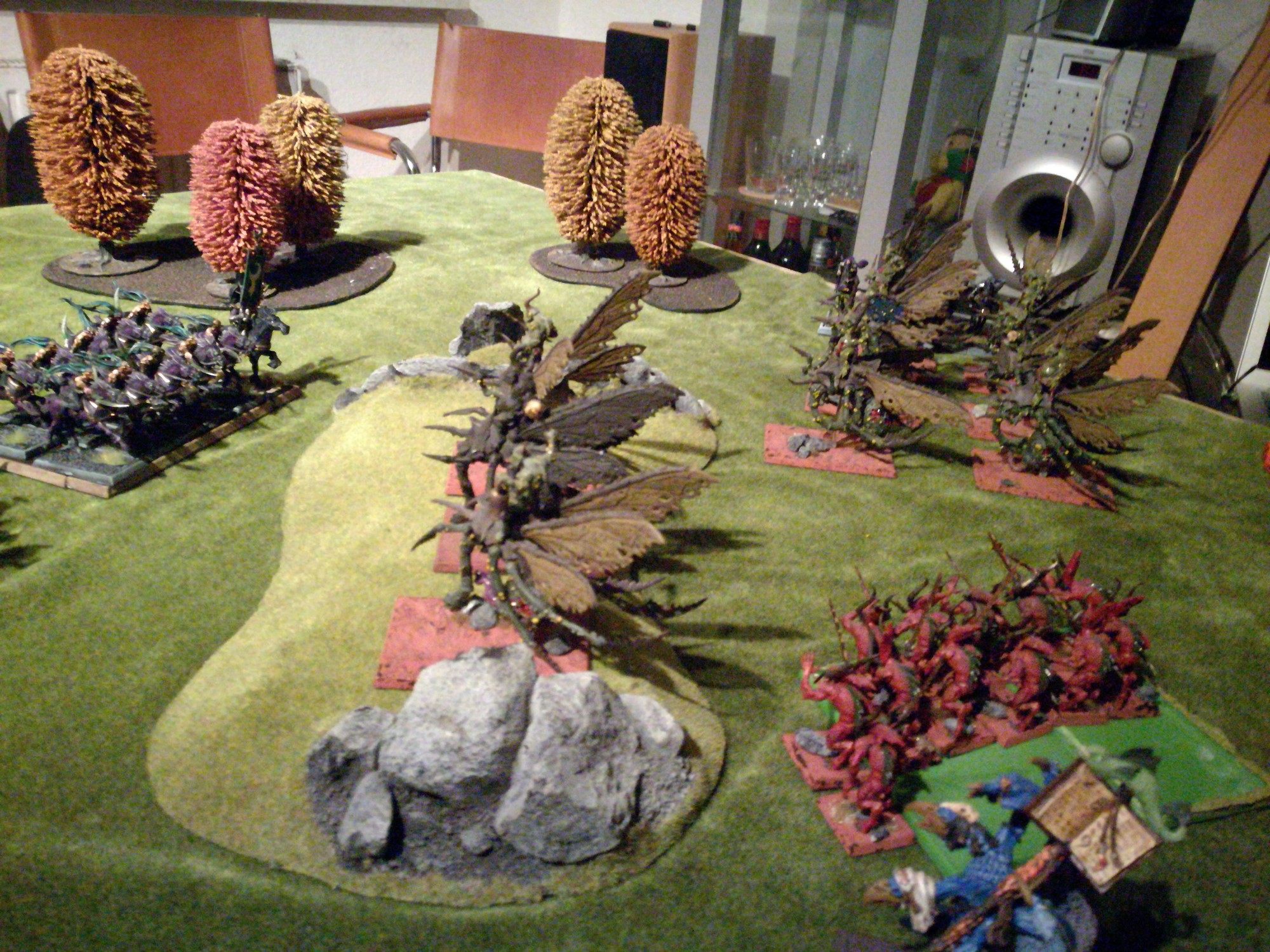 Die andere Schlacht wird deutlich entspannter - da geht es nur darum, dass ein anderer Freund seine neu aufgebauten Orks und Goblins testen möchte. Deshalb da auch keine Dunkelelfen und keine miese Armeeliste. Gegen die O&G ziehen meine Echsenmenschen mal wieder in die Schlacht. Mein erster Entwurf: